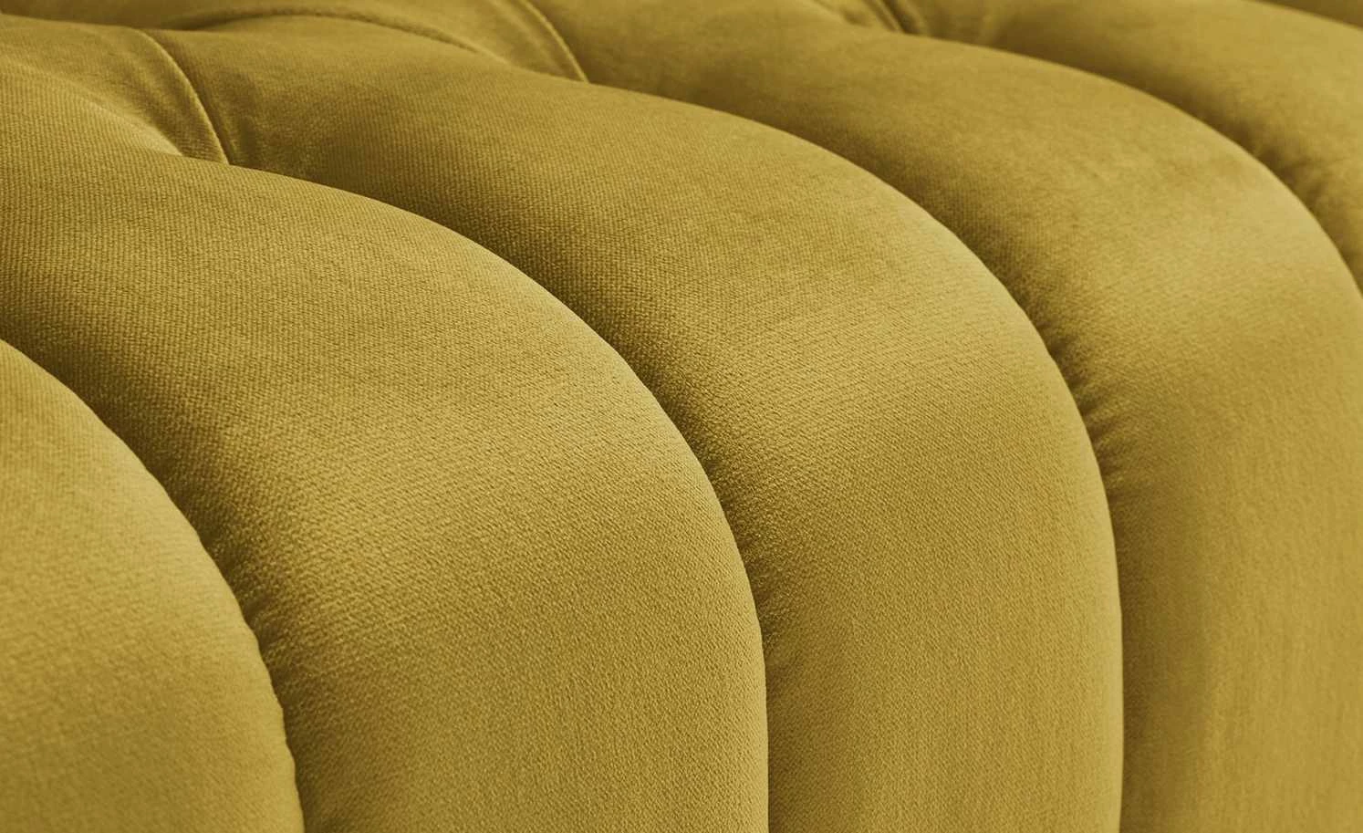 Das Big Sofa Canyon ist ein Eyecatcher im Vintage-Design. Es fällt durch seine vielen schönen Details auf. Die geschwungene Formgebung von Rückenlehne und Armlehnen und die Steppungen mit Zierknöpfen erinnern an den klassischen Chesterfield-Stil. Selbst die stabilen Massivholzfüße des Sofas sind dekorativ gearbeitet. Canyon ist mit einem Samtstoff bezogen – einschließlich der gesamten Rückseite. Der Bezug fühlt sich angenehm weich an und hat ein glänzendes Finish. Er bringt die Farbe wunderbar zur Geltung. Neben der Optik punktet das Big Sofa mit einem bequemen Sitzkomfort. Dafür sorgen die dicke Polsterung mit gut abfedernder Wellenunterfederung und die angenehme Sitztiefe.