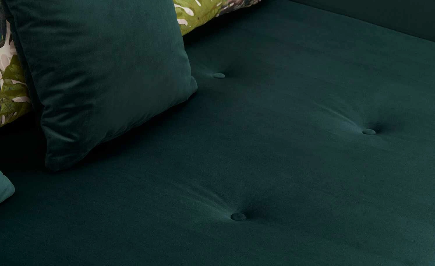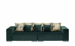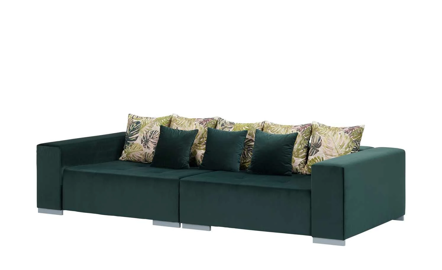 Edel und gemütlich zugleich: Das Big Sofa Maxi in samtig glänzendem Waldgrün. Die hochwertige Schaumstoffpolsterung sorgt für langanhaltenden Sitzkomfort. Der samtige Mikrofaserbezug und die ebenso weichen Kissen erhöhen den Gemütlichkeitsfaktor. Fünf der acht mitgelieferten Zierkissen sind mit einem Palmendruck versehen und verleihen dem Big Sofa Maxi einen edlen Dschungel-Look. Die Massivholzfüße sind dezent gehalten und runden das Gesamterscheinungsbild des Sofas ab. Platzieren Sie das Big Sofa gern auch mittig im Raum: Auch der Rücken der Couch ist mit dem waldgrünen Stoff bezogen.