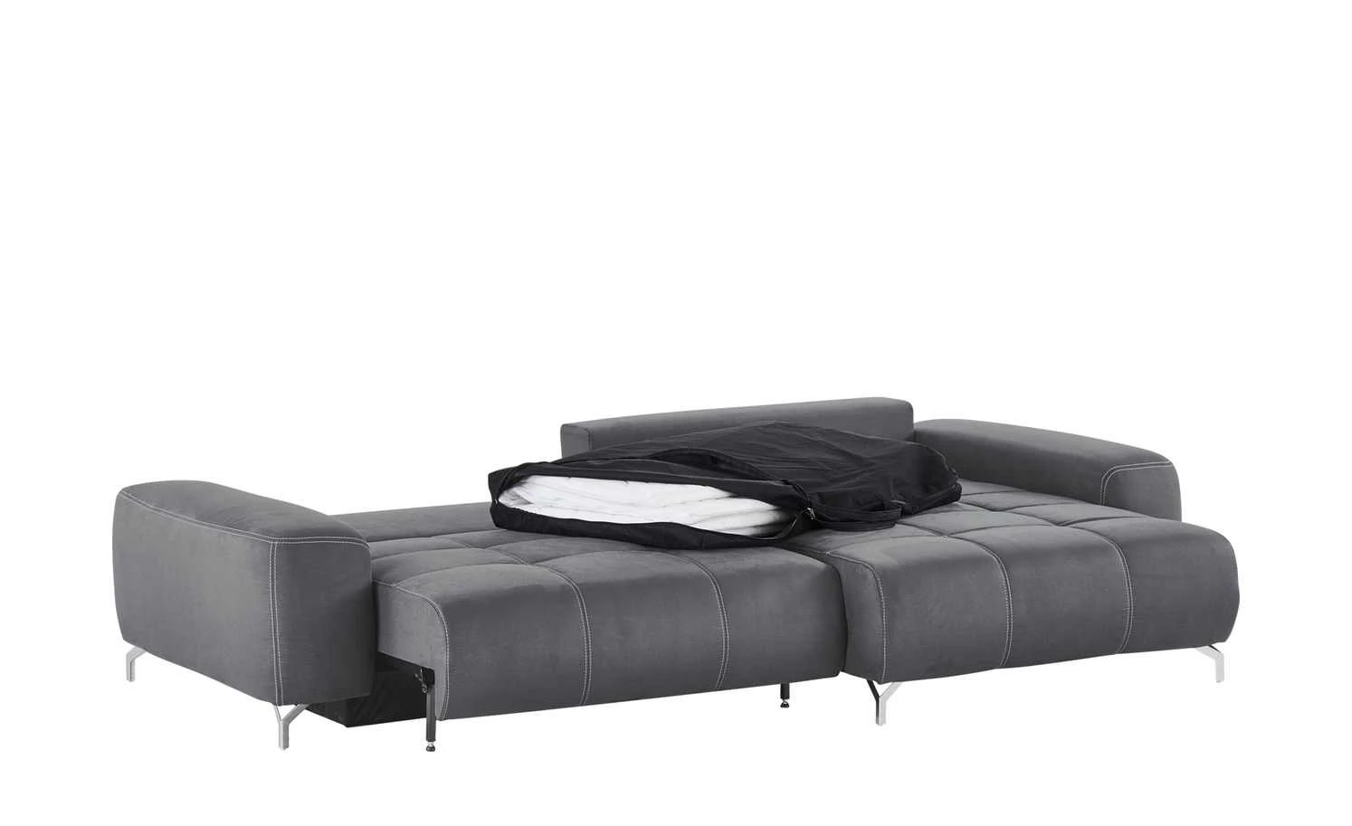 Das Ecksofa Filis de Luxe können Sie gut als Gästebett nutzen. Mit wenigen Handgriffen ist es zum Bett ausgezogen. Für mehr Liegekomfort ist ein weicher Topper im Lieferumfang enthalten. Darüber hinaus hat Filis de Luxe einen Federkern und eine Boxspringpolsterung. Sie können Sie sie auch mittig im Wohnzimmer platzieren. Mehrere weiche Kissen sind im Lieferumfang enthalten. Dazu gehören drei Rücken-, drei Nieren- und zwei Zierkissen. Alle acht greifen den Farbton des Bezuges auf.