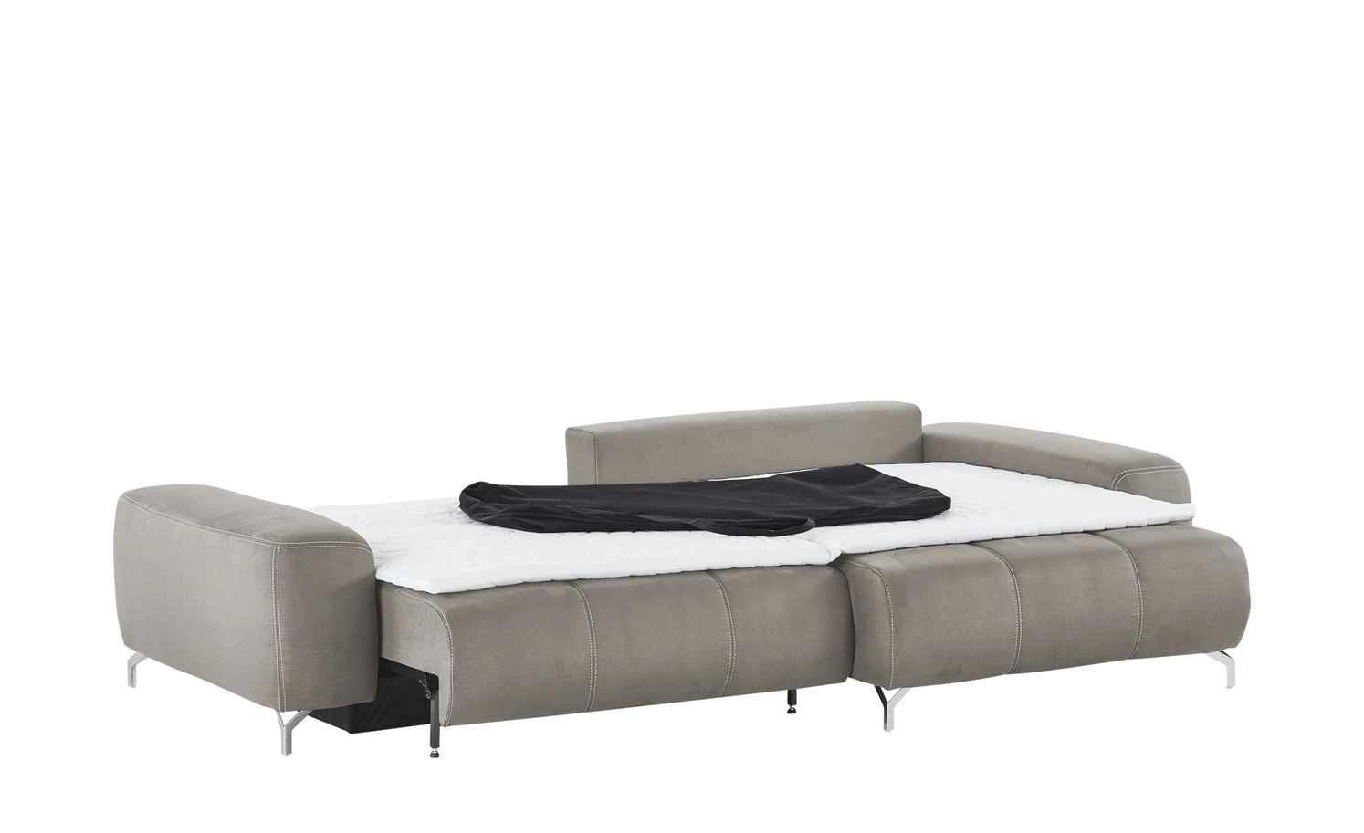 Das Ecksofa Filis de Luxe können Sie gut als Gästebett nutzen. Mit wenigen Handgriffen ist es zum Bett ausgezogen. Für mehr Liegekomfort ist ein weicher Topper im Lieferumfang enthalten. Darüber hinaus hat Filis de Luxe einen Federkern und eine Boxspringpolsterung. Sie können Sie sie auch mittig im Wohnzimmer platzieren. Mehrere weiche Kissen sind im Lieferumfang enthalten. Dazu gehören drei Rücken-, drei Nieren- und zwei Zierkissen. Alle acht greifen den Farbton des Bezuges auf.