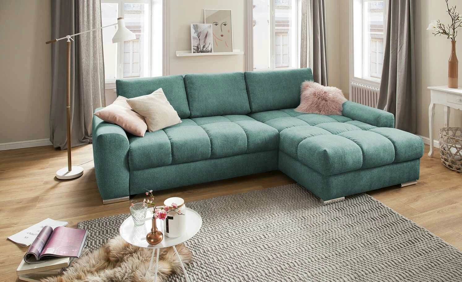 Das Ecksofa Soumia fällt durch die quadratische Steppung seiner Sitzfläche sofort ins Auge. Die Schaumstoffpolsterung und die Wellenunterfederung sorgen für langanhaltenden Sitz- und Liegekomfort. Soumia besitzt eine Schlaffunktion und kann mit wenigen Handgriffen zum Gästebett umfunktioniert werden. Die Bettwäsche für den Besuch können Sie im praktischen Bettkasten unter der Sitzfläche verstauen. Das kompakte Sofa in L-Form ist komplett bezogen und kann auch frei im Raum stehen. Die chromfarbigen Füße passen zum edlen und modernen Erscheinungsbild von Soumia.