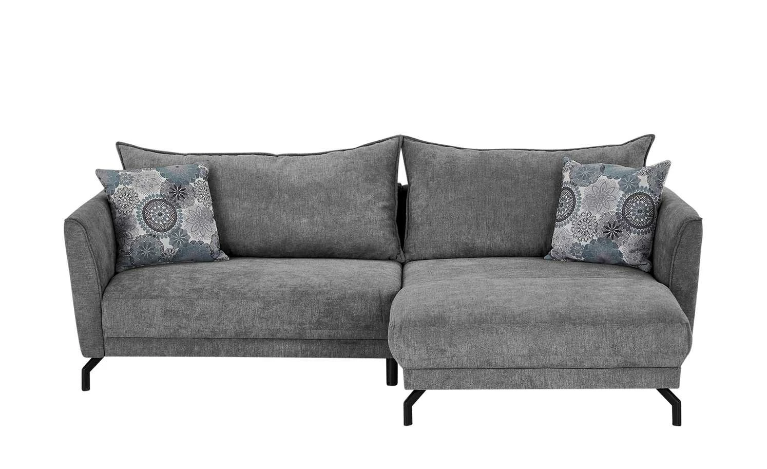 Ein urbaner und gleichzeitig gemütlicher Look macht das Ecksofa Yolanda zum optischen Highlight des Wohnzimmers. Die moderne Linienführung wird durch Winkelfüße aus schwarzem Metall ergänzt. Die beiden Zierkissen mit Mandala-Muster setzen punktuelle Akzente; sie sind im Lieferumfang enthalten. Eine hochwertige Polsterung aus Polyätherschaum sorgt für Sitzkomfort; sie wird durch eine Nosag-Wellenunterfederung unterstützt und noch besser abgefedert. Dank der extra breiten Récamiere können Sie gerne auch mal die Beine hochlegen und so noch besser entspannen. Die Couch ist rundherum mit Mikrofaser bezogen – einschließlich der gesamten Rückseite. Das gibt Ihnen die Möglichkeit Yolanda auch zentral im Raum zu platzieren.