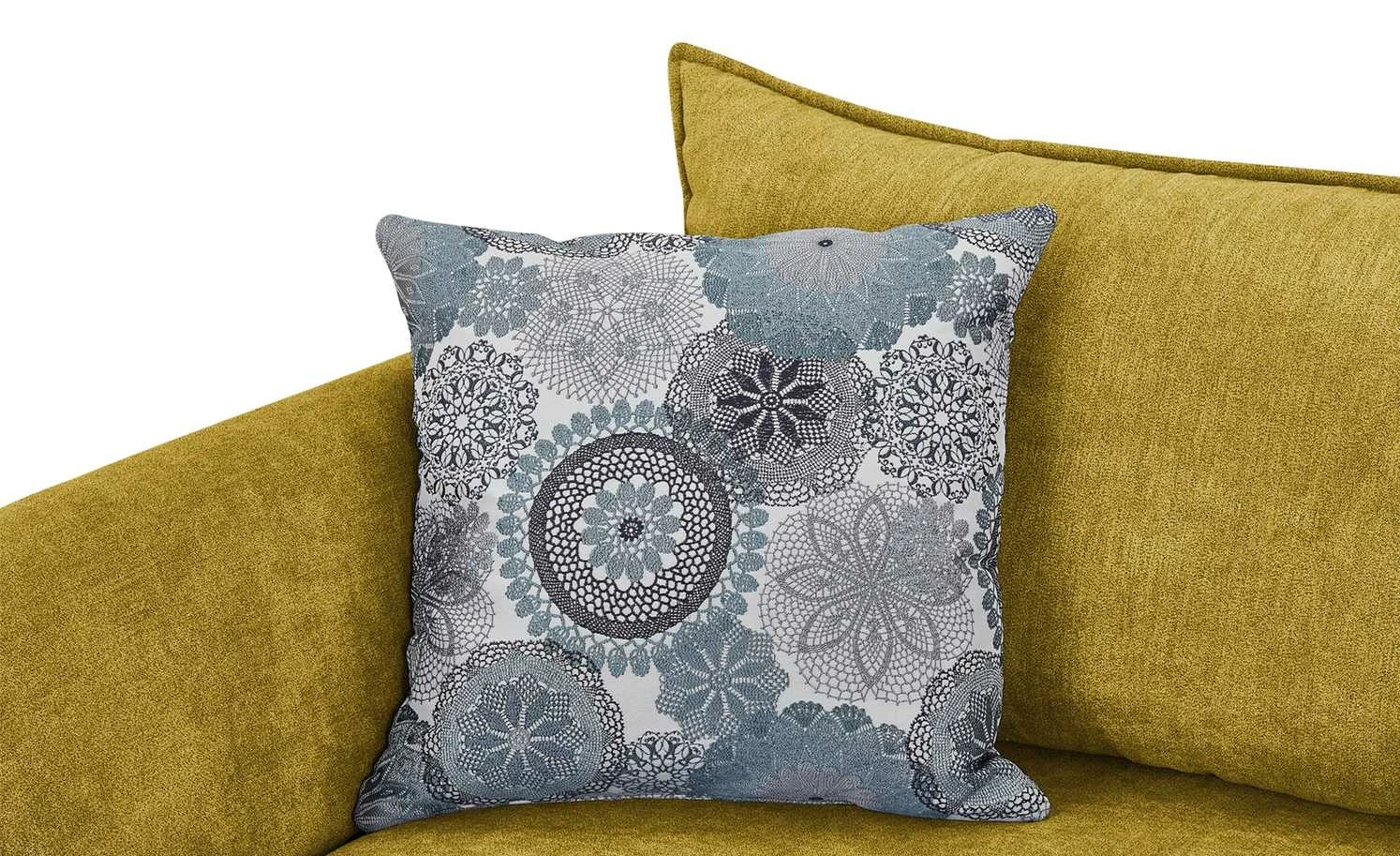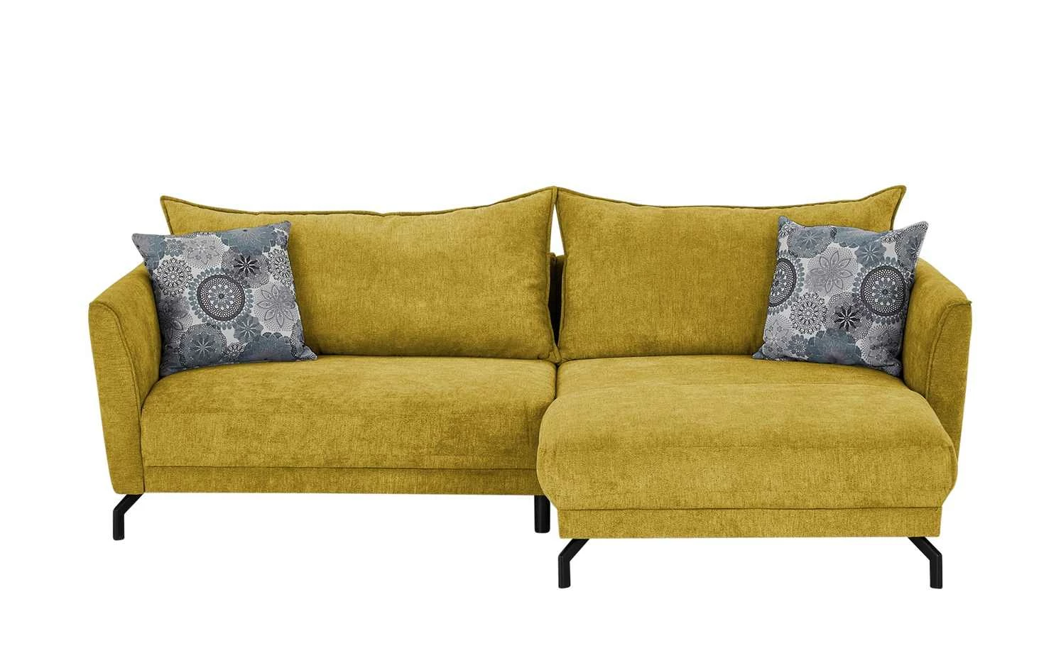 Ein urbaner und gleichzeitig gemütlicher Look macht das Ecksofa Yolanda zum optischen Highlight des Wohnzimmers. Die moderne Linienführung wird durch Winkelfüße aus schwarzem Metall ergänzt. Die beiden Zierkissen mit Mandala-Muster setzen punktuelle Akzente; sie sind im Lieferumfang enthalten. Eine hochwertige Polsterung aus Polyätherschaum sorgt für Sitzkomfort; sie wird durch eine Nosag-Wellenunterfederung unterstützt und noch besser abgefedert. Dank der extra breiten Récamiere können Sie gerne auch mal die Beine hochlegen und so noch besser entspannen. Die Couch ist rundherum mit Mikrofaser bezogen – einschließlich der gesamten Rückseite. Das gibt Ihnen die Möglichkeit Yolanda auch zentral im Raum zu platzieren.