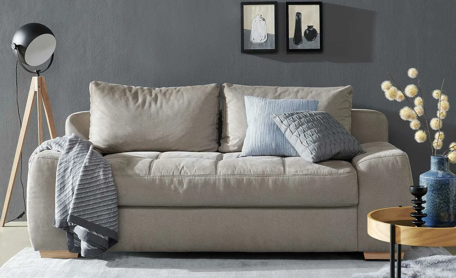 Das Schlafsofa Eleny de Luxe ist komplett mit dem weichen Mikrofaserstoff bezogen und kann dadurch auch frei im Raum stehen.