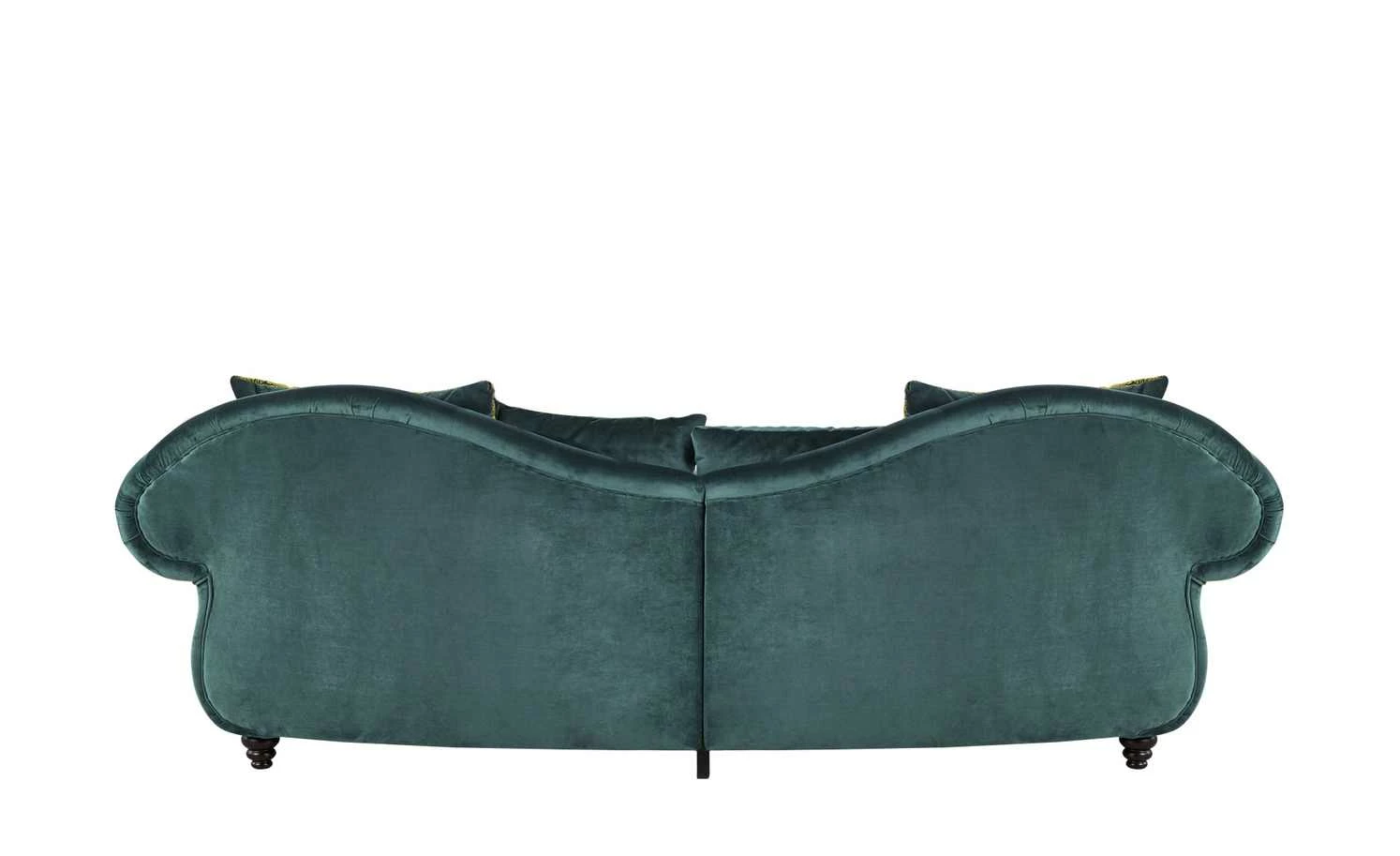 Nobody ist ein opulent designtes Big Sofa mit Vintage-Note. Mit seinem geschwungenen Rücken, den Armlehnen in eingedrehter Optik und Absteppungen fällt es sofort auf. Passend dazu: Der Mikrofaserbezug in Samtoptik. Er umschließt die Couch komplett – auch auf der Rückseite. Deshalb können Sie Nobody frei im Zimmer platzieren. Fünf Kissen sind im Lieferumfang enthalten. Ein Eyecatcher sind die beiden Rücken-Wendekissen mit ihrem auffälligen, goldfarbenen Rankenmuster.