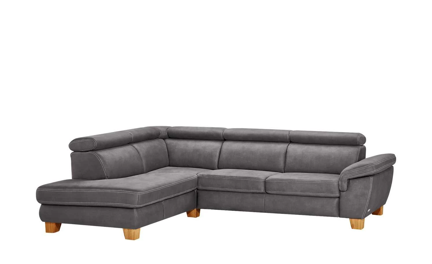 Indra ist ein elegantes und komfortables Ecksofa der Marke Wohnwert. Der dunkle Mikrofaserbezug hat eine leichte Lederoptik. Davon setzen sich die hellen Ziernähte besonders kontrastreich ab. Der originale Bezug ist auch auf der Rückseite des Sofas zu finden. So können Sie es vor eine Wand, aber auch mitten in Ihrem Wohnzimmer platzieren. Viel Sitzkomfort bietet Indra durch den hochwertigen PUR Schaum als Polsterung und die Wellenunterfederung im Sitzbereich. Dank der verstellbaren Kopfteile können Sie sich bequem anlehnen.
