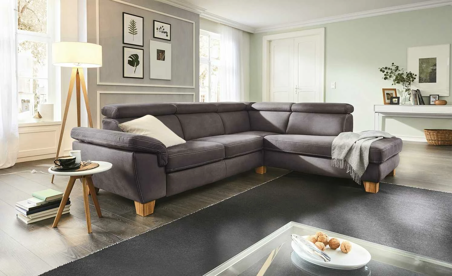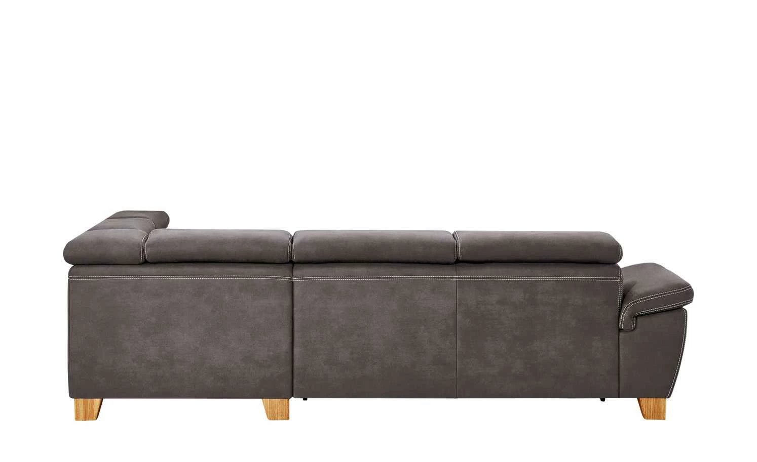 Indra ist ein elegantes und komfortables Ecksofa der Marke Wohnwert. Der dunkle Mikrofaserbezug hat eine leichte Lederoptik. Davon setzen sich die hellen Ziernähte besonders kontrastreich ab. Der originale Bezug ist auch auf der Rückseite des Sofas zu finden. So können Sie es vor eine Wand, aber auch mitten in Ihrem Wohnzimmer platzieren. Viel Sitzkomfort bietet Indra durch den hochwertigen PUR Schaum als Polsterung und die Wellenunterfederung im Sitzbereich. Dank der verstellbaren Kopfteile können Sie sich bequem anlehnen.