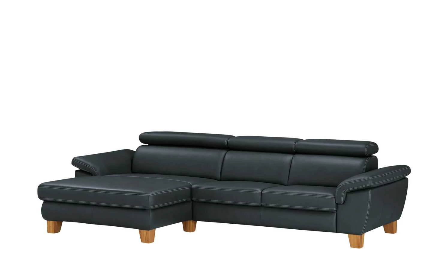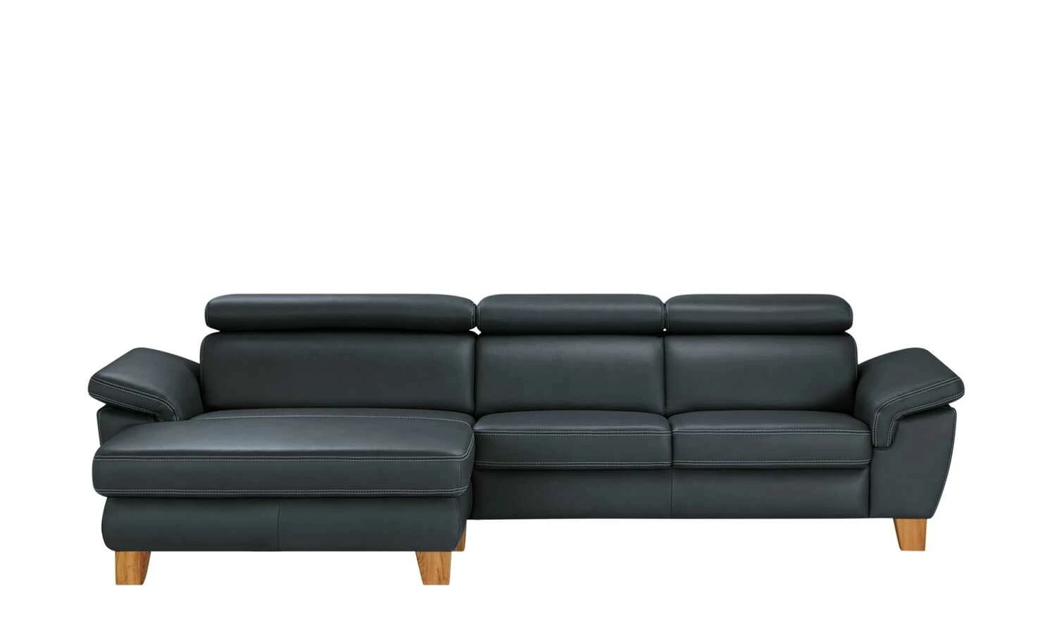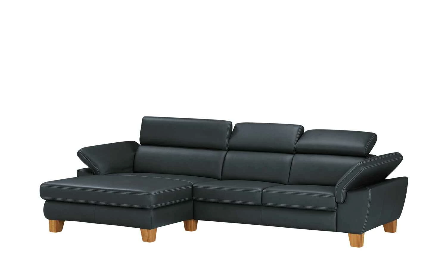 Modern und aus hochwertigem Echtleder: Das Ecksofa Indra. Der mattglänzende Lederbezug ist mit einer dekorativen weißen Kontrastnaht versehen und veredelt das Gesamterscheinungsbild. Massivholzfüße aus geölter Eiche runden den modernen Look gekonnt ab. Machen Sie es sich auf Ihrem neuen Sofa bequem und verstellen Sie ganz einfach die Kopfteile. Die hochwertige PUR-Schaum-Polsterung und die Wellenunterfederung sorgen für langanhaltenden Sitzkomfort. Das Ecksofa Indra ist auch auf der Rückseite mit dem Echtleder bezogen und kann daher frei im Raum platziert werden.