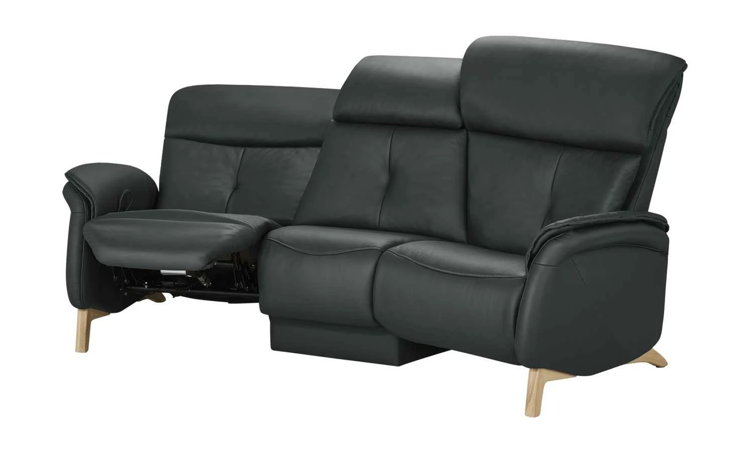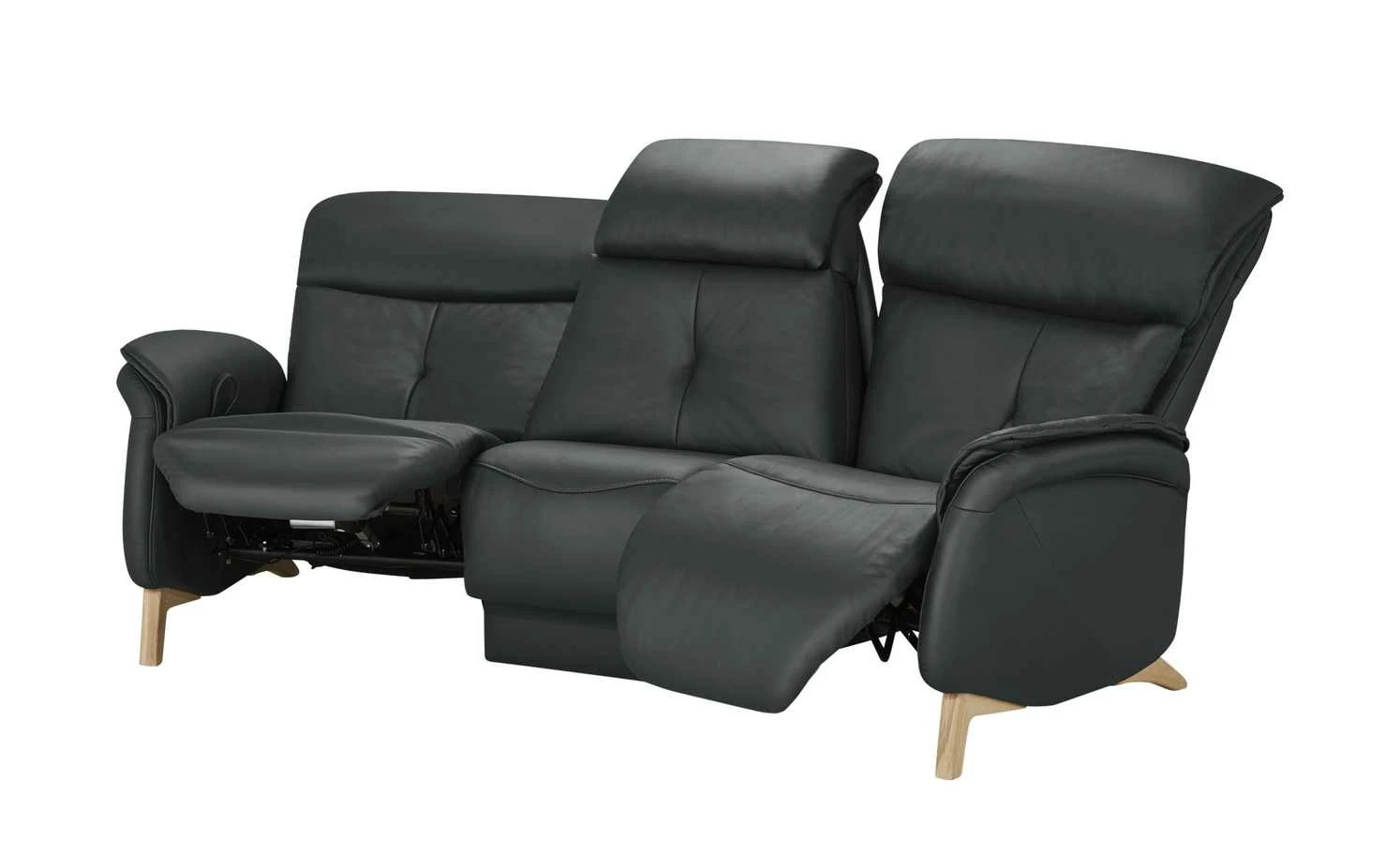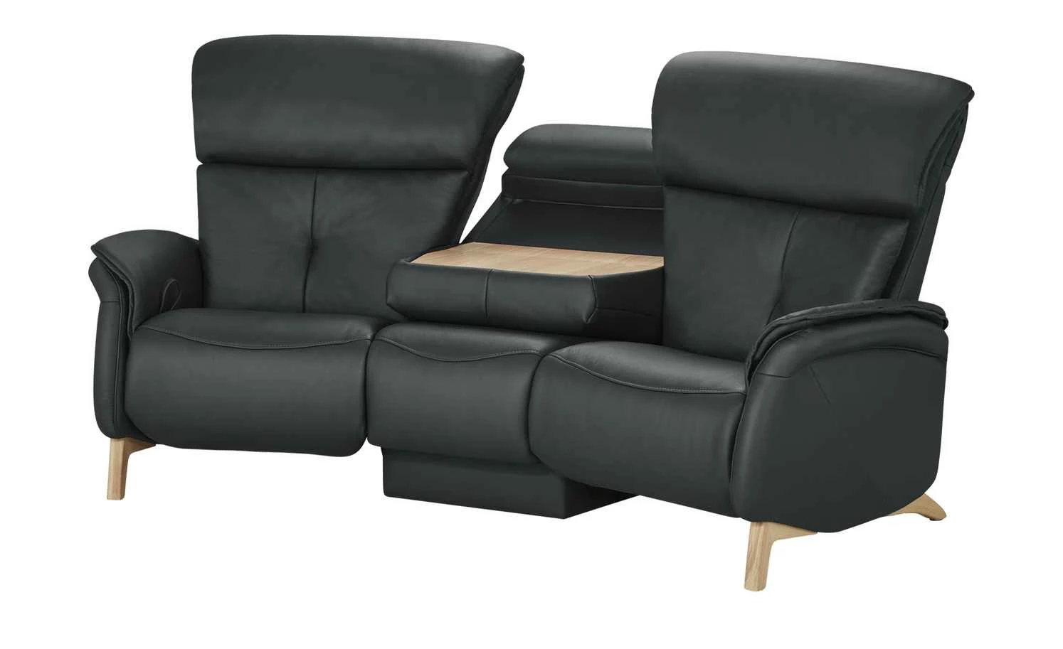 Lassen Sie den Tag ausklingen und genießen Sie entspannte Stunden vor dem Fernseher. Dieses komfortable Ledersofa kombiniert dicke Polsterbereiche mit einer integrierten Relaxfunktion. Die beiden äußeren Sitze lassen sich kinderleicht in Relaxposition stellen: Unabhängig voneinander. Klappen Sie das Mittelteil ganz einfach um, wenn Sie einen praktischen Beistelltisch benötigen. Hier finden Getränke, Snacks und die Fernbedienung problemlos Platz. Ein edler Echtlederbezug mit dekorativen Nähten umspannt das gesamte Sofa. Absteppungen betonen die dicken Polsterbereiche und geben dem Markensofa eine moderne Note. Bewusst gesetzte Akzente aus Wildeichen-Massivholz verleihen dem Ledersofa außerdem einen natürlichen Touch.