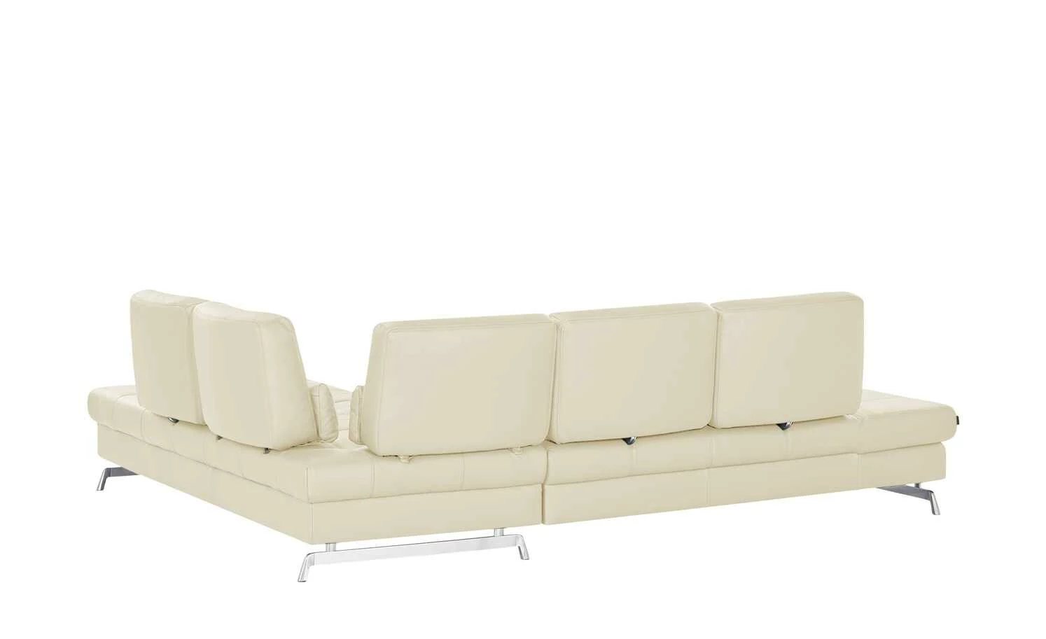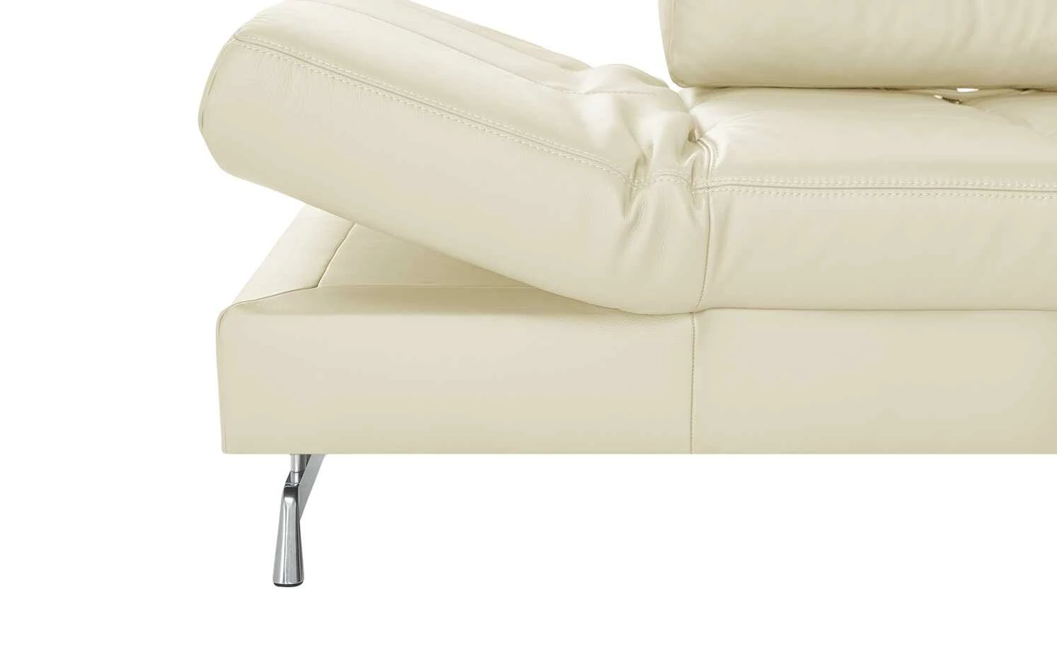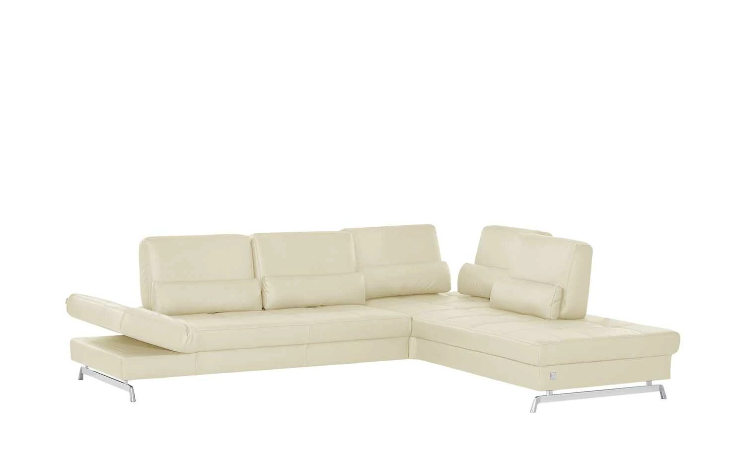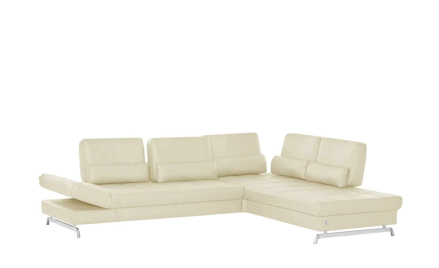 Ein echtes Designerstück ist das Ecksofa der Marke Joop!. Das sanft schimmernde Echtleder und die gesteppte Sitzfläche sind in jedem Raum ein Eyecatcher. Die Metall-Kufenfüße in Chrom-Optik veredeln das Gesamterscheinungsbild. Die markanten Rückenlehnen verleihen dem Ecksofa außerdem einen modernen Touch. Zwei Rückenlehnen an der Ecke lassen sich verstellen und auch die Armlehnen können Sie je nach Bedarf hochklappen. Die hochwertige Kaltschaumpolsterung sorgt für langanhaltenden Komfort.