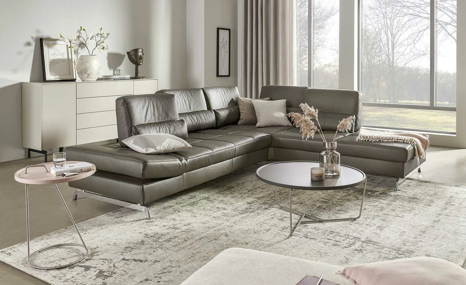 Ein echtes Designerstück ist das Ecksofa der Marke Joop!. Das sanft schimmernde Echtleder und die gesteppte Sitzfläche sind in jedem Raum ein Eyecatcher. Die Metall-Kufenfüße in Chrom-Optik veredeln das Gesamterscheinungsbild. Die markanten Rückenlehnen verleihen dem Ecksofa außerdem einen modernen Touch. Zwei Rückenlehnen an der Ecke lassen sich verstellen und auch die Armlehnen können Sie je nach Bedarf hochklappen. Die hochwertige Kaltschaumpolsterung sorgt für langanhaltenden Komfort.