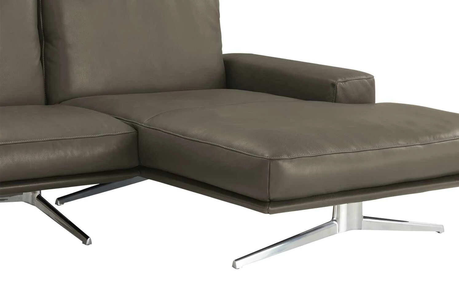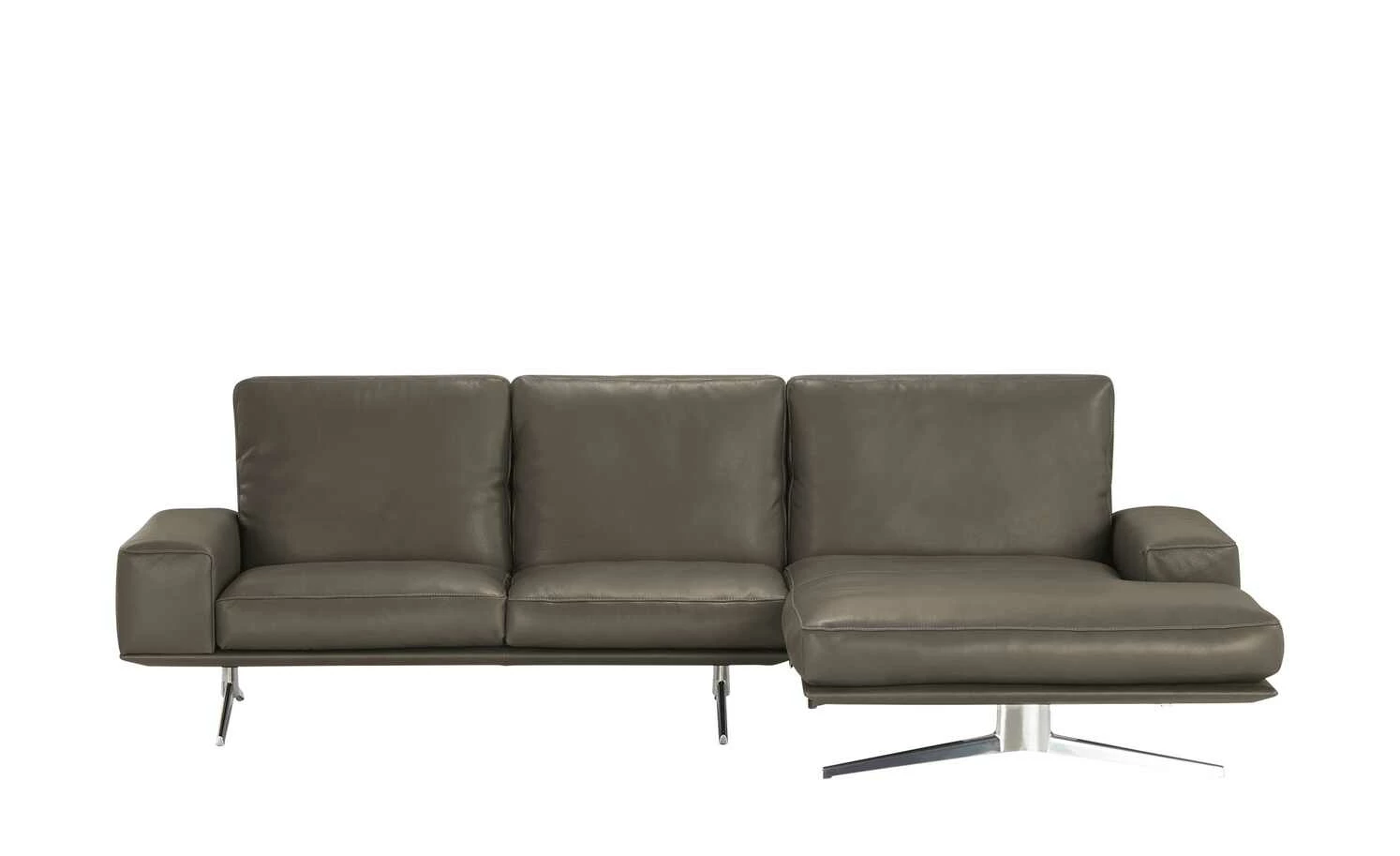 Das Ecksofa Hiero verbindet kubistische Design-Elemente mit einer modernen, klaren Linienführung. Akzentuiert wird dieser Designentwurf mit attraktiven Kontrasten in Material und Farbe. Nehmen Sie Platz und strecken Sie sich auf der extra breiten Ottomane bequem aus. Passen Sie die drei Rückenlehnen ganz Ihren Bedürfnissen an: Sie lassen sich mühelos und separat voneinander neigen. Die beiden breiten Armlehnen flankieren die Sitzfläche gekonnt und lenken den Fokus auf die einladende Sitzfläche. Der hochwertige Echtlederbezug umspannt das gesamte Sofa und setzt mit seiner Kontrastnaht liebevolle Akzente. Filigrane Schwertkufen aus poliertem Metall tragen das Ecksofa und scheinen es nahezu schweben zu lassen. Unikate gefertigt in Bayern: Die Marke KOINOR steht für einzigartige Komfortfunktionen und individuelles Design. Unter Verwendung hochwertigster Materialien entstehen Möbel mit Vorzeigecharakter.