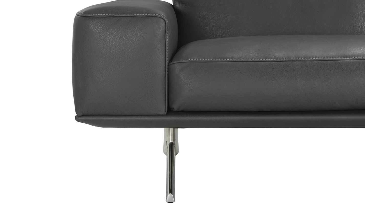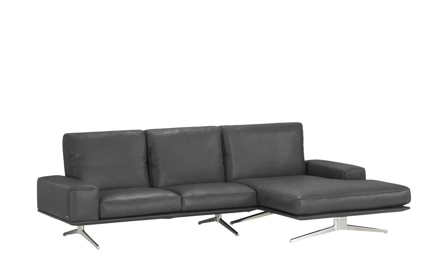 Das Ecksofa Hiero verbindet kubistische Design-Elemente mit einer modernen, klaren Linienführung. Akzentuiert wird dieser Designentwurf mit attraktiven Kontrasten in Material und Farbe. Nehmen Sie Platz und strecken Sie sich auf der extra breiten Ottomane bequem aus. Passen Sie die drei Rückenlehnen ganz Ihren Bedürfnissen an: Sie lassen sich mühelos und separat voneinander neigen. Die beiden breiten Armlehnen flankieren die Sitzfläche gekonnt und lenken den Fokus auf die einladende Sitzfläche. Der hochwertige Echtlederbezug umspannt das gesamte Sofa und setzt mit seiner Kontrastnaht liebevolle Akzente. Filigrane Schwertkufen aus poliertem Metall tragen das Ecksofa und scheinen es nahezu schweben zu lassen. Unikate gefertigt in Bayern: Die Marke KOINOR steht für einzigartige Komfortfunktionen und individuelles Design. Unter Verwendung hochwertigster Materialien entstehen Möbel mit Vorzeigecharakter.