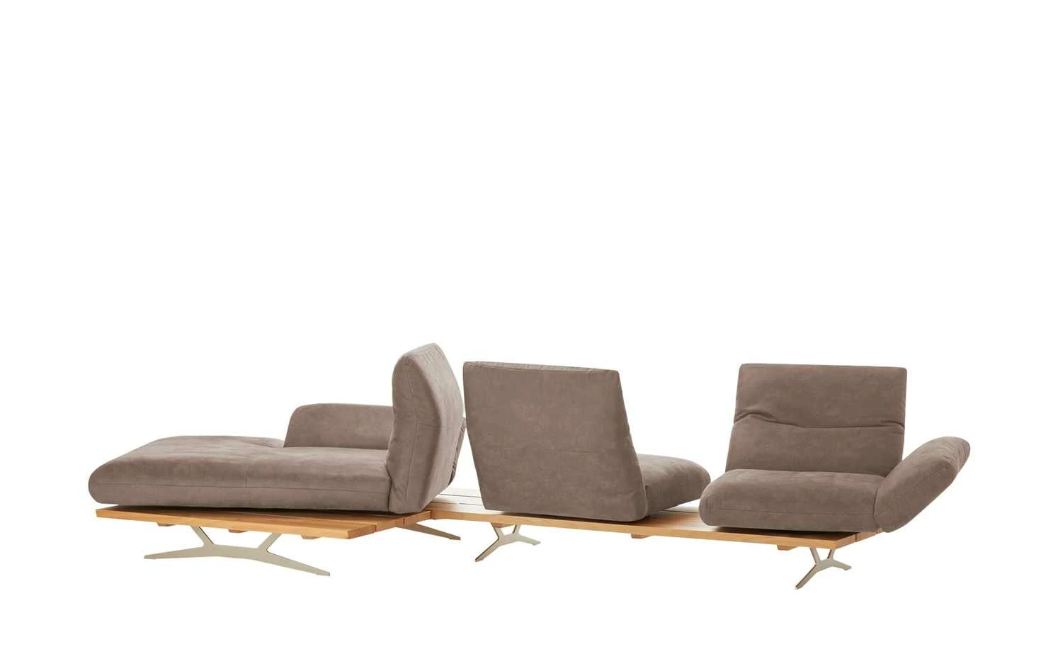 Eine faszinierende Art von Schwerelosigkeit erzeugt das Ecksofa Marilyn durch sein natürliches Holzplateau. Schmale Schwertkufen aus satiniertem Nickel tragen das massive Kernbuchenholz, auf dem die multifunktionalen Polster aufliegen. Eine weiche Mikrofaser in authentischer Leder-Optik komplettiert das Zusammenspiel. Verstellen Sie die Kopfteile und Armlehnen ganz nach Ihren Wünschen. Die ausgeklügelte Dreh- und Schiebefunktion ermöglicht individuelle Sitzpositionen. Die einzelnen Sitzflächen können Sie ganz einfach auseinander ziehen, wodurch drei separate Sitzgelegenheiten entstehen. Wie für Möbel der Marke KOINOR üblich, sind sämtliche Hebel und Griffe direkt im Sofa integriert, damit die Optik nicht gestört wird. Entscheiden Sie sich für eine von vielen modernen Farben und erleben Sie ein ganz neues Raumgefühl.