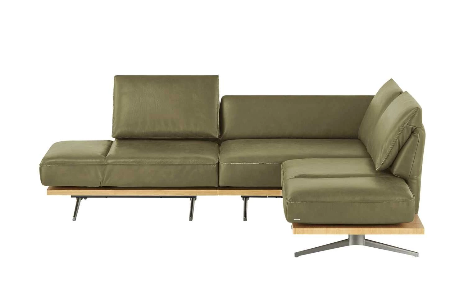 Beim Ecksofa Phoenix vereinigen sich ausgeklügelte Funktionen und exklusives Design. Dieses Zusammenspiel und liebevolle Details machen das Ecksofa Phoenix zu einem absoluten Lieblingsmöbelstück. Weiches Anilinleder zeigt die Original-Beschaffenheit der Haut. Eine dekorative Kontrastnaht setzt attraktive Akzente. Die handgearbeiteten Polster liegen auf einem Massivholz-Plateau aus Wildeiche auf. Bronzierte Schwertkufen tragen das Plateau und scheinen das Sofa schweben zu lassen. Klappen Sie die Kopfteile und die Armlehnen ganz einfach um: Phoenix passt sich Ihren Bedürfnissen ganz individuell an.