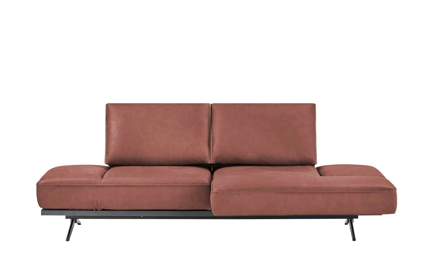 Beim Liegensofa Phoenix trifft moderne Vielseitigkeit auf höchsten Komfort. Auf einem schwerelos anmutenden Plateau in dunkler Stein-Optik liegen edle Polster aus weichem Anilinleder auf. Die einzigartige Struktur der Haut und ein dekorativer Keder machen das Liegensofa zu einem echten Unikat. Mattschwarze Metall-Schwertkufen greifen den elegant-modernen Look gekonnt auf und verleihen dem Sofa ein Gefühl von schwereloser Leichtigkeit. Verstellen Sie ganz einfach die Armlehnen und klappen Sie die Kopfteile hoch: Das Liegensofa Phoenix erfüllt problemlos Ihre Komfort-Ansprüche. Auch die Rückenlehnen lassen sich kinderleicht per Knopfdruck nach hinten klappen. Wie für die Marke KOINOR üblich, sind alle Verstell-Elemente dezent in den Bezug eingearbeitet und stören die Optik nicht.