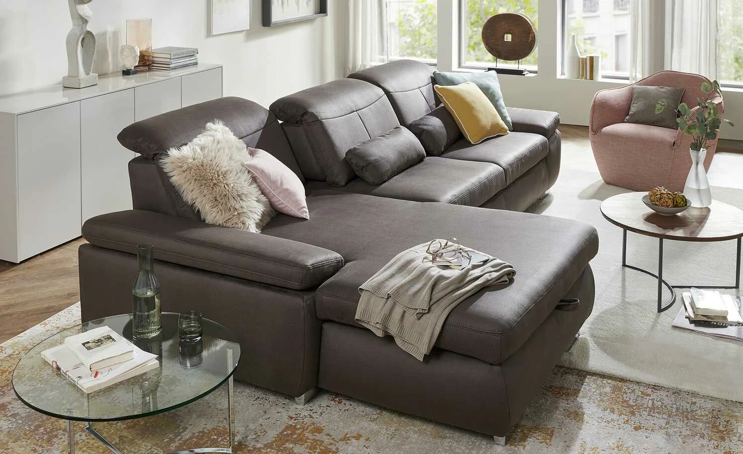 Mit dem Sofa nutzen Sie Ihre vier Wände perfekt aus. Das Sofa ist aufgrund der Kopfteilverstellung und der manuellen Sitztiefenverstellung extrem komfortabel und dient aufgrund eines im Lieferumfang enthaltenen Bettkastens als Stauraummöbel. Es besitzt eine Ottomane auf der linken Seite und lässt sich dank der Bettfunktion zu einem bequemen Gästebett umbauen. Dieses Sofa sorgt für einen gemütlichen Wohnstil mit Gelassenheit und Gefühl.