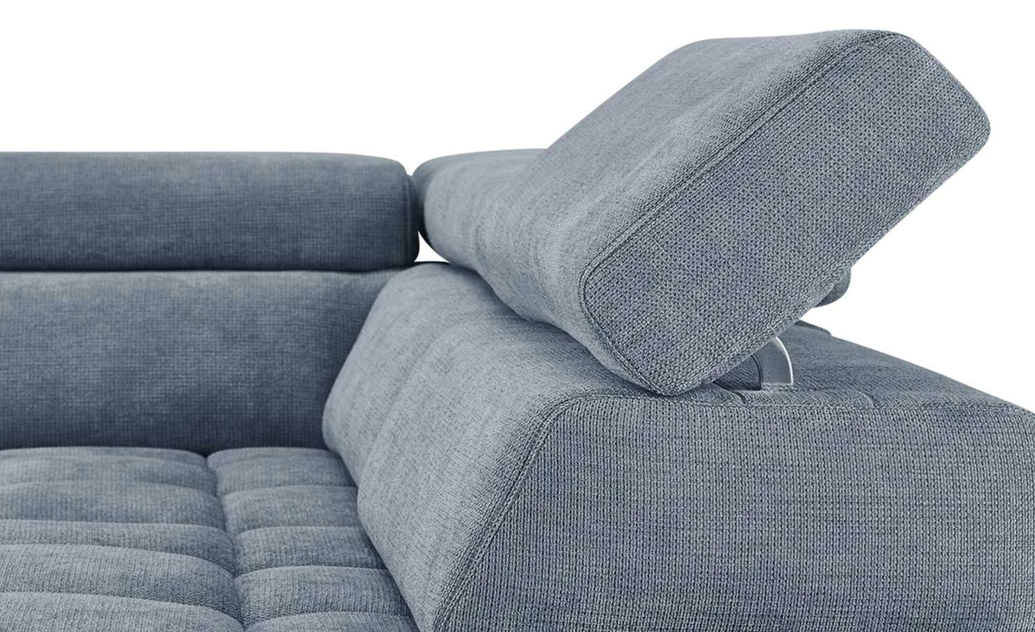 Cooles Design und Sitzkomfort machen das Ecksofa Lagoon zum Highlight des Wohnraumes. Sitzbereich, Rücken- und Armlehne sind mit hochwertigem Kaltschaum gepolstert. Der Sitzbereich wird zusätzlich durch eine Wellenunterfederung unterstützt. Verstellen Sie die Kopfteile in die gewünschte Position. So haben Sie die Möglichkeit auch mal den Kopf anzulegen, wenn Sie möchten. Perfekt, um es sich so richtig gemütlich zu machen. Lagoon ist mit einem attraktiven Webstoff bezogen. Dabei wurde auch die gesamte Rückseite bedacht, damit Sie die Couch mitten ins Zimmer stellen können. Der gesamte Sitzbereich ist quadratisch gesteppt. Zusätzliche Akzente werden durch die verchromten Füße gesetzt.