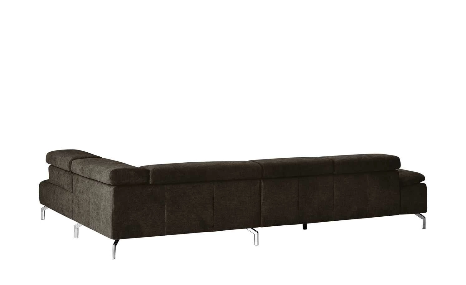 Cooles Design und Sitzkomfort machen das Ecksofa Lagoon zum Highlight des Wohnraumes. Sitzbereich, Rücken- und Armlehne sind mit hochwertigem Kaltschaum gepolstert. Der Sitzbereich wird zusätzlich durch eine Wellenunterfederung unterstützt. Verstellen Sie die Kopfteile in die gewünschte Position. So haben Sie die Möglichkeit auch mal den Kopf anzulegen, wenn Sie möchten. Perfekt, um es sich so richtig gemütlich zu machen. Lagoon ist mit einem attraktiven Webstoff bezogen. Dabei wurde auch die gesamte Rückseite bedacht, damit Sie die Couch mitten ins Zimmer stellen können. Der gesamte Sitzbereich ist quadratisch gesteppt. Zusätzliche Akzente werden durch die verchromten Füße gesetzt.