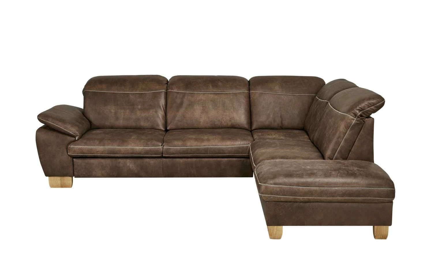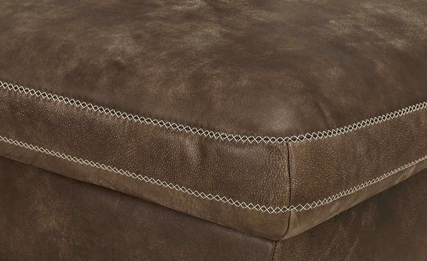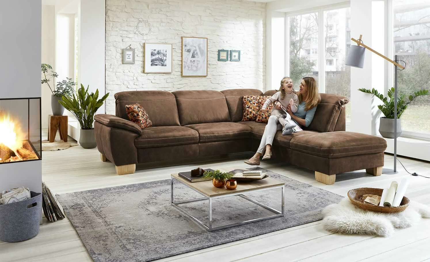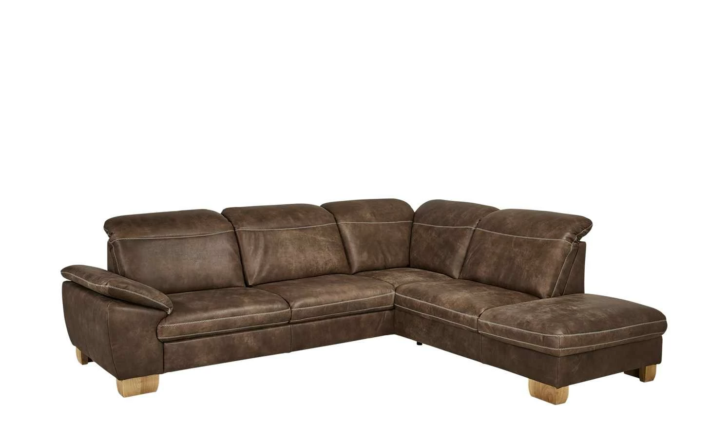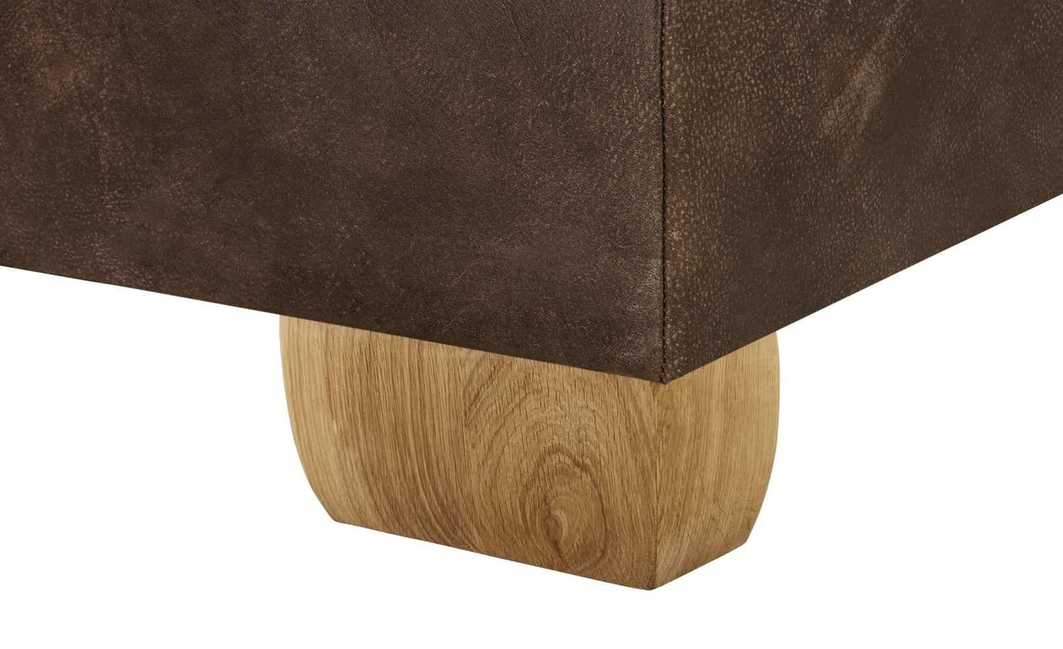 Mit hochwertigem Echtleder ist das Ecksofa Raica bezogen. Das Leder hat eine attraktive Vintage-Optik die mit beigen Kontrastnähten akzentuiert wird. Auch die Füße aus massiver Wildeiche setzen sich vom Bezug ab. Für den Komfort beim Relaxen ist Raica mit einem Federkern und einer Wellenunterfederung ausgestattet.