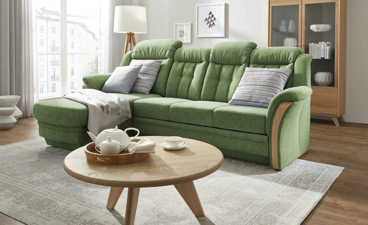 Das Ecksofa Andorra sticht durch seine Massivholz-Blende an beiden Armlehnen sofort ins Auge. Das helle Eichenholz setzt dabei einen bewussten Kontrast zum Bezug des Sofas. Machen Sie es sich auf dem Ecksofa Andorra gemütlich: Das weiche Flachgewebe und die hochwertige Kaltschaumpolsterung sorgen für hohen Sitzkomfort. Die Kopfteile von Andorra lassen sich ganz leicht stufenlos verstellen. Außerdem praktisch: Unter der Ottomane finden Sie einen geräumigen Bettkasten, in dem Sie zum Beispiel Zierkissen und Kuscheldecken verstauen können.