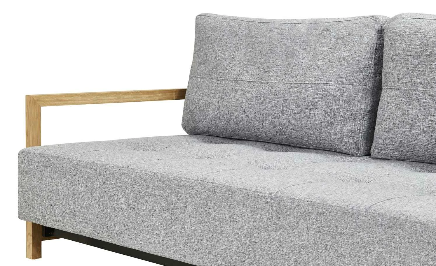 Couch und Bett in einem? Das ist das Sofa Akkito. Tagsüber ist es eine bequeme Sitzgelegenheit. Nachts wird Akkito zum gemütlichen Bett. Die integrierte Schlaffunktion macht es möglich. So wird die Couch einfach zum Bett ausgeklappt. Dank des langlebigen Federkerns sitzen und liegen Sie richtig komfortabel. Akkito ist aber auch hübsch anzusehen. Der granitgrau melierte Bezug wird durch die Seiten aus Massivholz abgesetzt. Das Eichenholz sorgt für einen natürlichen Look. Da auch die gesamte Rückseite mit dem gleichen Stoff wie die Vorderseite bezogen ist, sieht Akkito von allen Seiten gut aus. Und kann gerne auch mittig in den Raum gestellt werden.