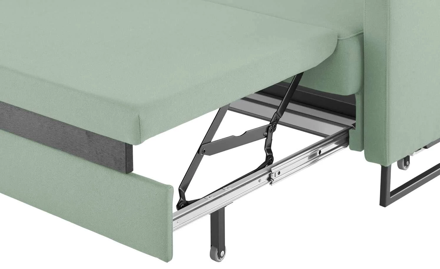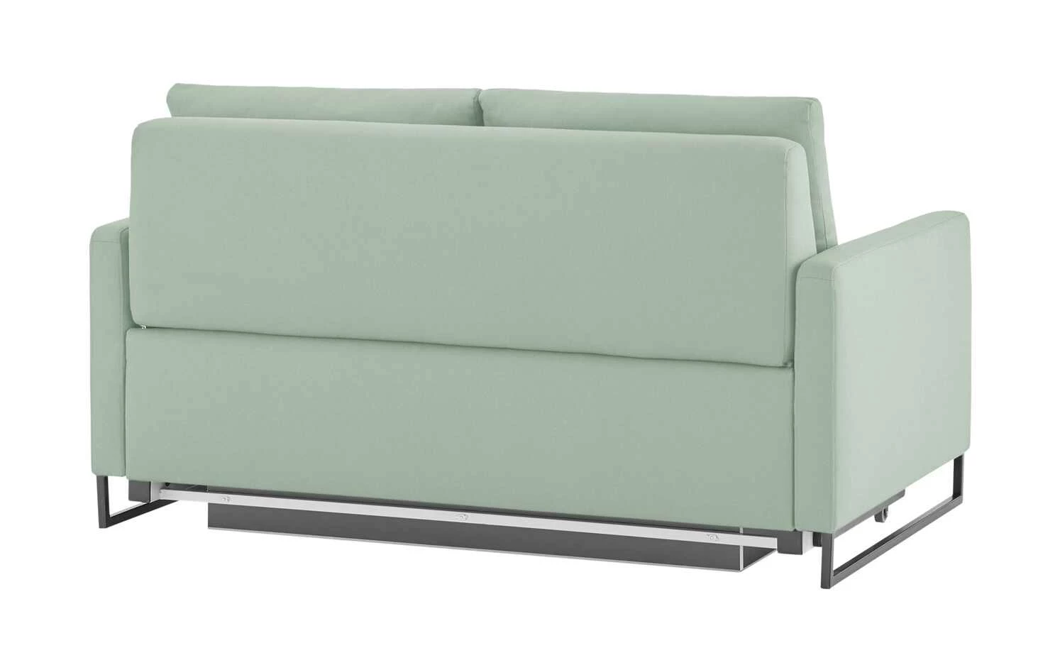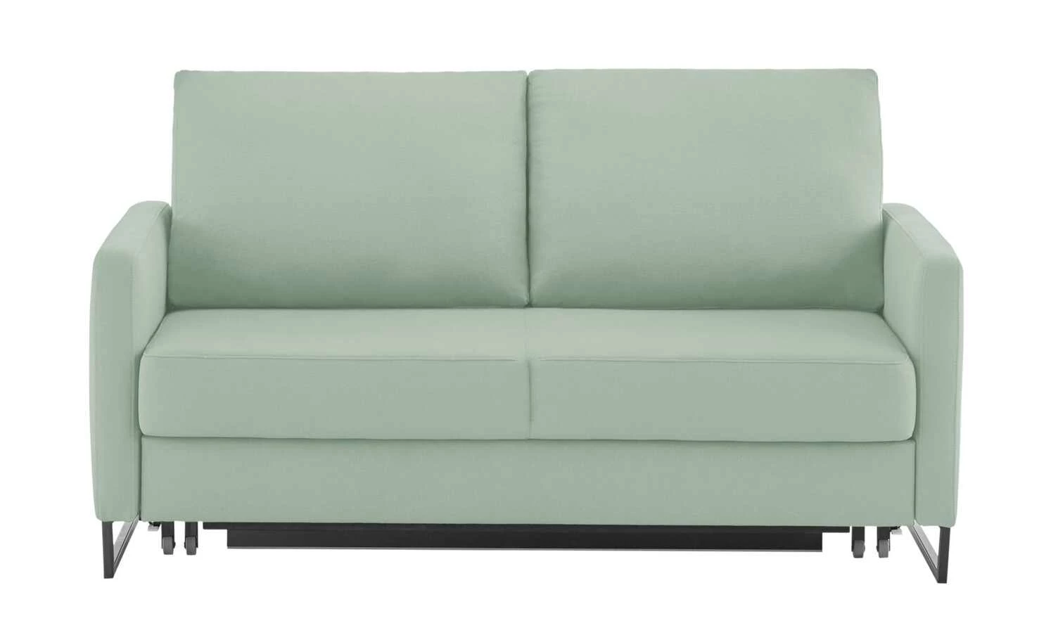 Das Schlafsofa Fürth passt durch sein modernes Design in nahezu jeden Einrichtungsstil. Die schwarzen Metallfüße in trendiger Kufenform heben sich vom einfarbigen Bezug aus strapazierfähigem Flachgewebe ab. Das Sofa ist außerdem mit einer Schlaffunktion ausgestattet: Fahren Sie dazu ganz einfach den unteren Teil mithilfe der Rollen aus und ziehen sie an der Schlaufe. Klappen Sie die Rückenlehne zurück und nutzen Sie nun die großzügige Liegefläche von 140 x 200 Zentimetern. Im praktischen Bettkasten des Sofas können Sie die passende Bettwäsche für Ihre Gäste verstauen. Übrigens: Das Schlafsofa Fürth ist auch auf der Rückseite bezogen und kann somit frei im Raum stehen.