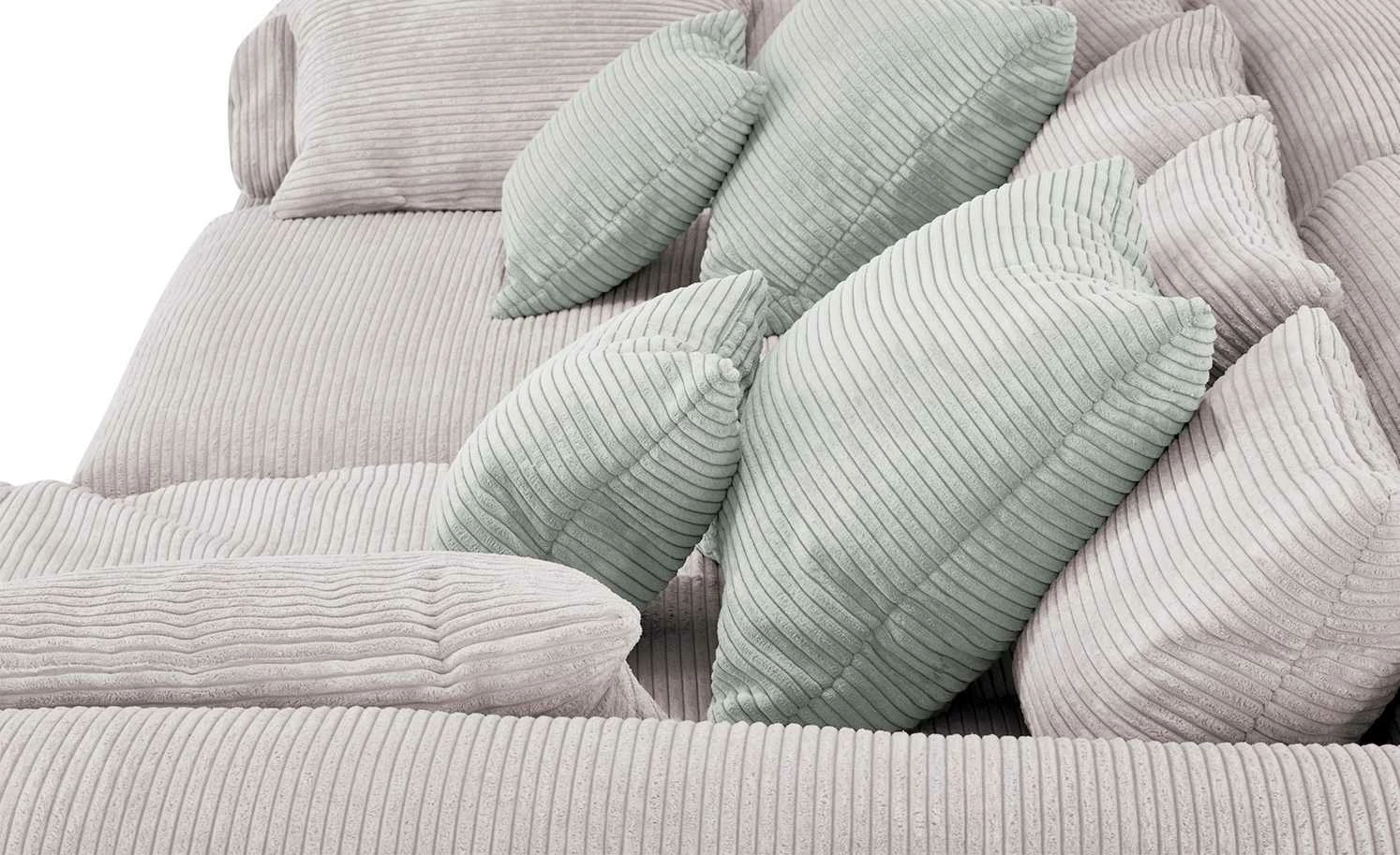 Das Ecksofa Lianea ist eine wahre Wohlfühl-Oase. Die komfortable Schaumstoffpolsterung und der weiche Stoff laden zum gemütlichen Beisammensein ein. Auch die Rückseite des Sofas ist bezogen: Lianea kann daher auch mittig im Raum platziert werden. Besonders gemütlich wird es mit den zwölf Kissen, die im Lieferumfang enthalten sind. Das Ecksofa gibt es in zahlreichen Farbvarianten und passt daher in nahezu jedes Wohnzimmer.