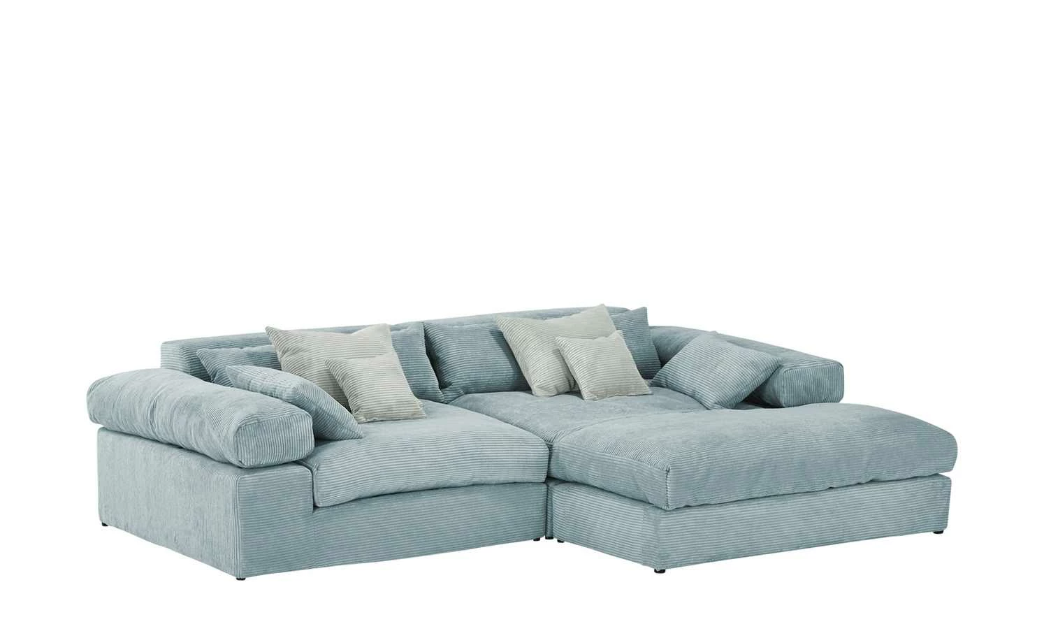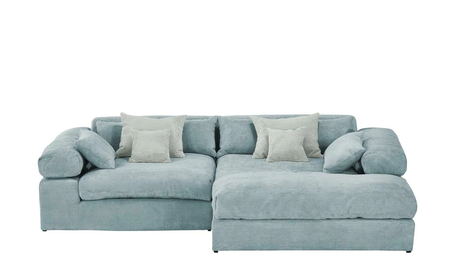 Das Ecksofa Lianea ist eine wahre Wohlfühl-Oase. Die komfortable Schaumstoffpolsterung und der weiche Stoff laden zum gemütlichen Beisammensein ein. Auch die Rückseite des Sofas ist bezogen: Lianea kann daher auch mittig im Raum platziert werden. Besonders gemütlich wird es mit den zwölf Kissen, die im Lieferumfang enthalten sind. Das Ecksofa gibt es in zahlreichen Farbvarianten und passt daher in nahezu jedes Wohnzimmer.