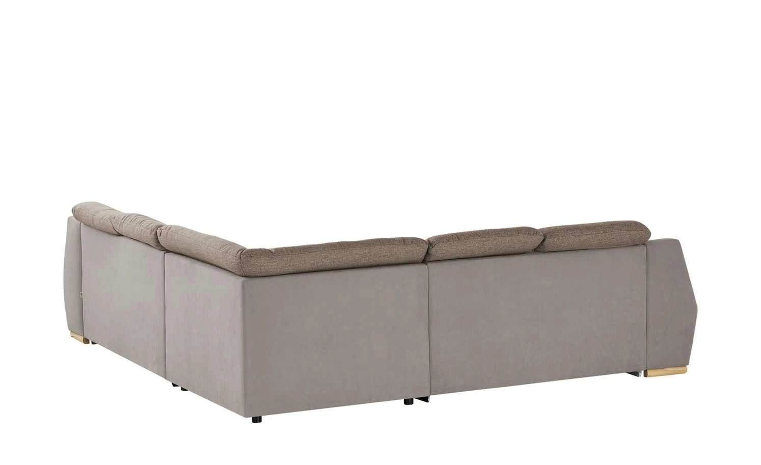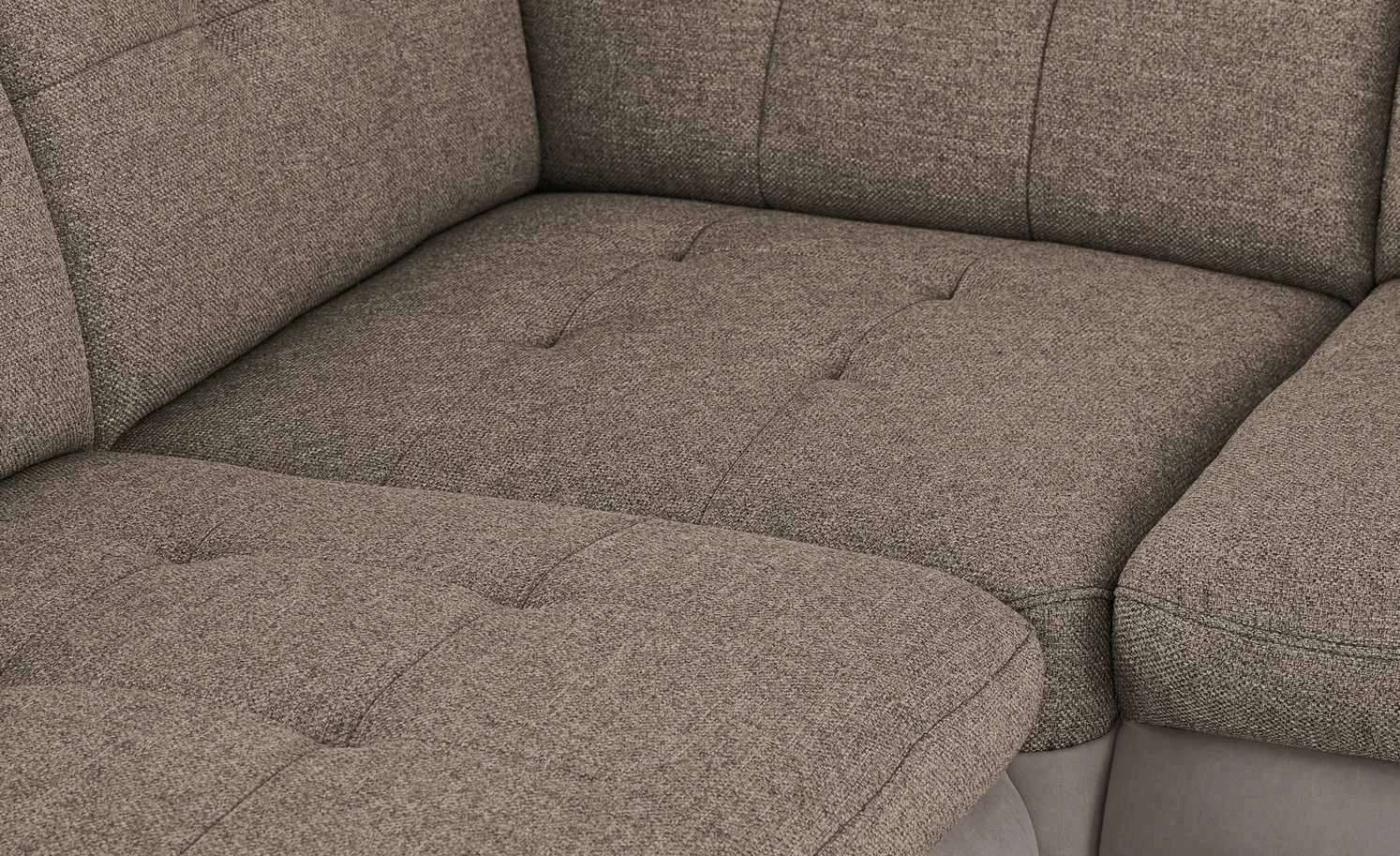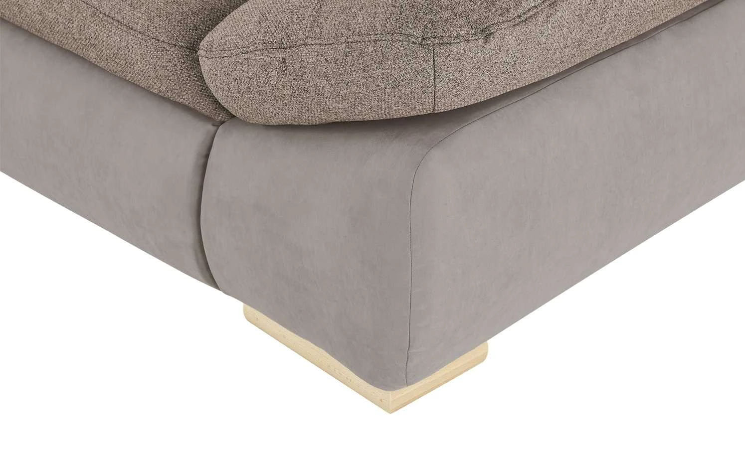 Das Ecksofa Lilli punktet mit seinen tollen Komfortausstattungen. Sitz, Rücken und Armlehnen sind mit einem hochwertigen Federkern und zusätzlichem Polyätherschaum gepolstert. Die Rückenlehne hat eine angenehme Höhe und ist leicht schräg, so dass Sie noch bequemer Sitzen können. Außerdem lassen sich die Kopfteile von zwei Sitzen verstellen. Beide Armlehnen sind mit einer Klappfunktion ausgestattet. Lilli kann mit wenigen Handgriffen zum Gästebett ausgezogen werden. Unter der Sitzfläche befindet sich ein ausziehbarer Bettkasten, der praktischen Stauraum bietet. Die Couch ist zweifarbig gestaltet. Während der Korpus mit einem Flachgewebe bezogen ist, auch auf der Rückseite, setzt sich die Sitz- und Rückenfläche vorne mit ihrem Webstoff ab.