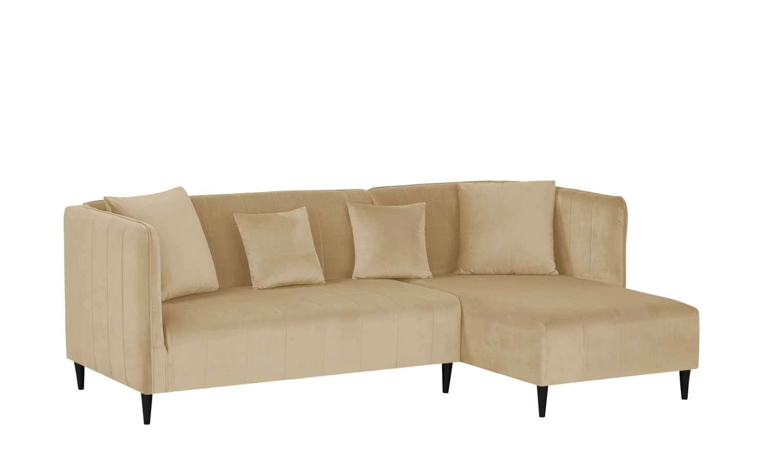 Edel und komfortabel zugleich: Das Ecksofa Sara fällt durch seinen leicht schimmernden Bezug aus samtig weicher Mikrofaser sofort auf. Der Stoff ist längs gesteppt – und das an allen Seiten. Sie können Sara daher auch problemlos mittig im Raum platzieren. Die hochwertige Schaumstoffpolsterung und die Wellenunterfederung sorgen für langanhaltenden Sitzkomfort. Vier weiche Zierkissen sind im Lieferumfang enthalten, sodass Sie es sich noch gemütlicher machen können. Schwarze Kegelfüße aus massivem Buchenholz runden den edlen Look von Sara gekonnt ab.