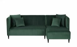 Edel und komfortabel zugleich: Das Ecksofa Sara fällt durch seinen leicht schimmernden Bezug aus samtig weicher Mikrofaser sofort auf. Der Stoff ist längs gesteppt – und das an allen Seiten. Sie können Sara daher auch problemlos mittig im Raum platzieren. Die hochwertige Schaumstoffpolsterung und die Wellenunterfederung sorgen für langanhaltenden Sitzkomfort. Vier weiche Zierkissen sind im Lieferumfang enthalten, sodass Sie es sich noch gemütlicher machen können. Schwarze Kegelfüße aus massivem Buchenholz runden den edlen Look von Sara gekonnt ab.