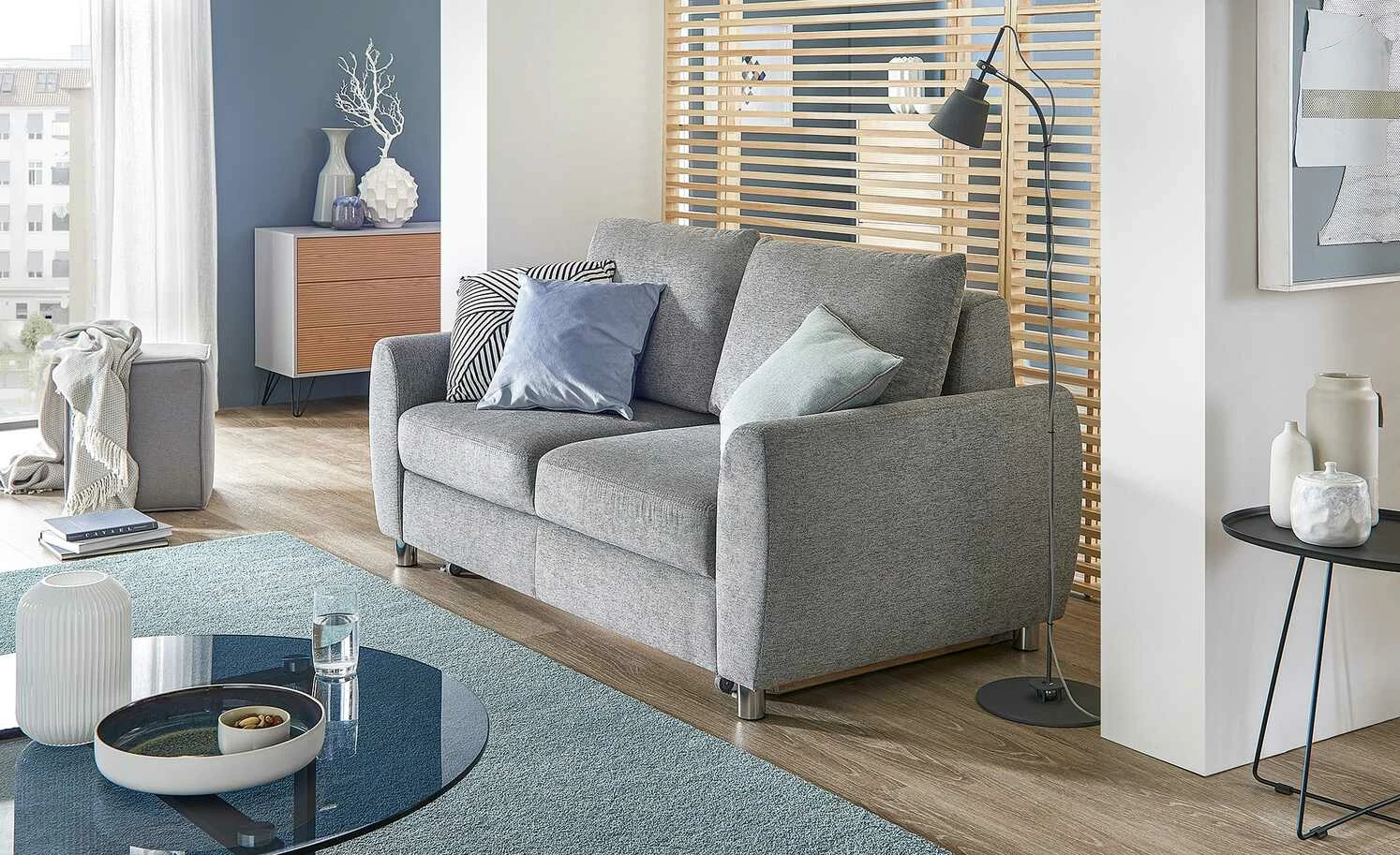 Das Sofa Valencia Schlafsofasystem bietet perfekte Voraussetzungen zum bequemen Ausruhen oder Sitzen. Qualität und Komfort vereinen sich in diesem Sofa der Marke smart gekonnt. Mikrofaser dient als Materialgrundlage für den Bezug der Sitz- und Rückenfläche. Das Sofa ist mit einem echt bezogenen Rücken ausgestattet, damit es auch mittig im Raum aufgestellt werden kann, lädt aufgrund der Wellenfederkerne sowie der komfortablen Polsterung aus Schaumstoff zum Relaxen ein und dient durch einen integrierten Bettkasten als Stauraummöbel. Es lässt sich mit der Bettfunktion in ein gemütliches Schlafsofa umwandeln und weist eine Sitzhöhe von 46 cm auf. Das Modell Valencia Schlafsofasystem wird durch die Sitztiefe von 54 cm zu einer richtigen Oase der Gemütlichkeit und nimmt insgesamt 95 × 178 cm ein. Dieses Sofa wird im Handumdrehen zum echten Entspannungsort, der Ihren vier Wänden auf zweckmäßige und ästhetische Art und Weise den letzten Schliff verleiht.