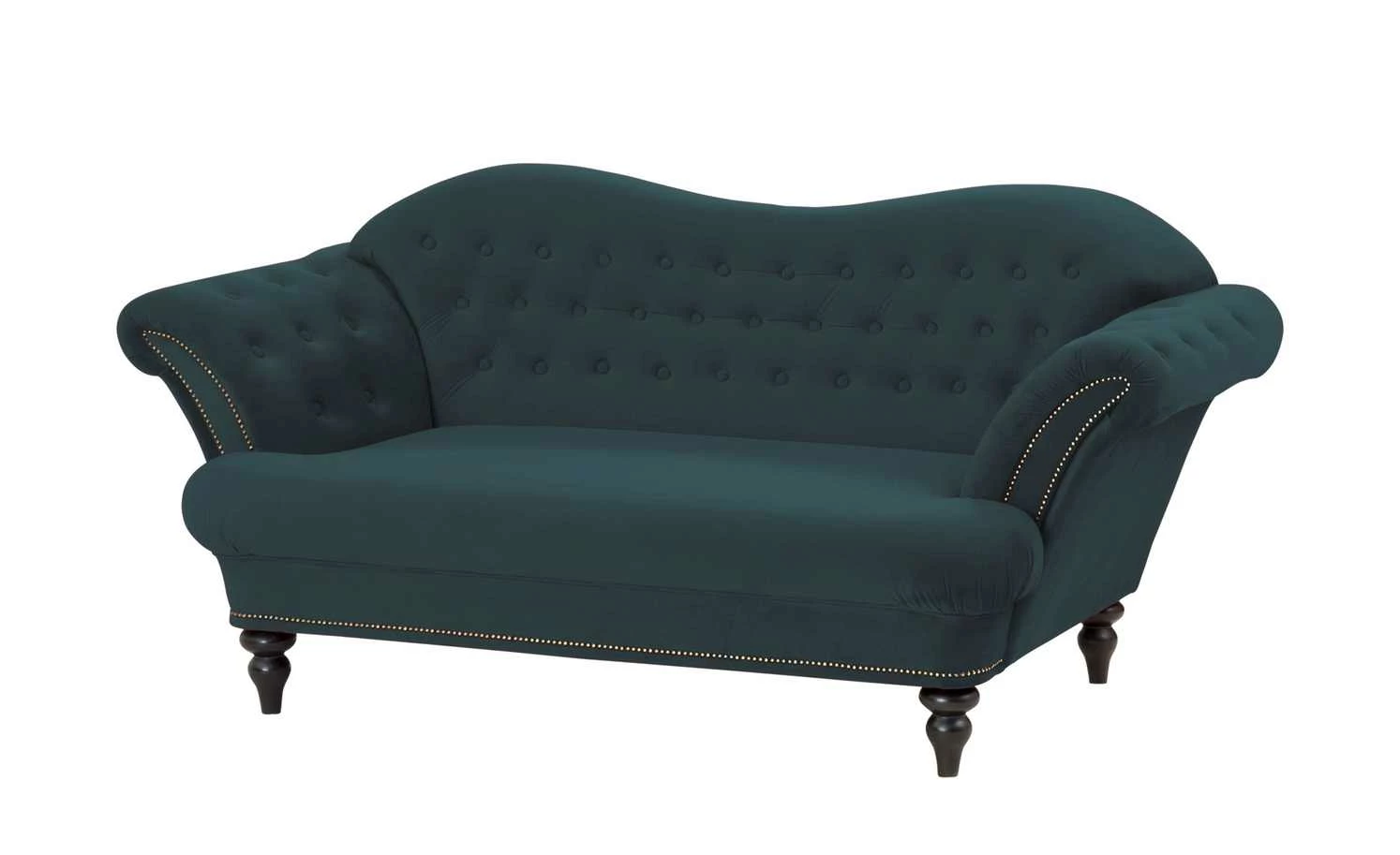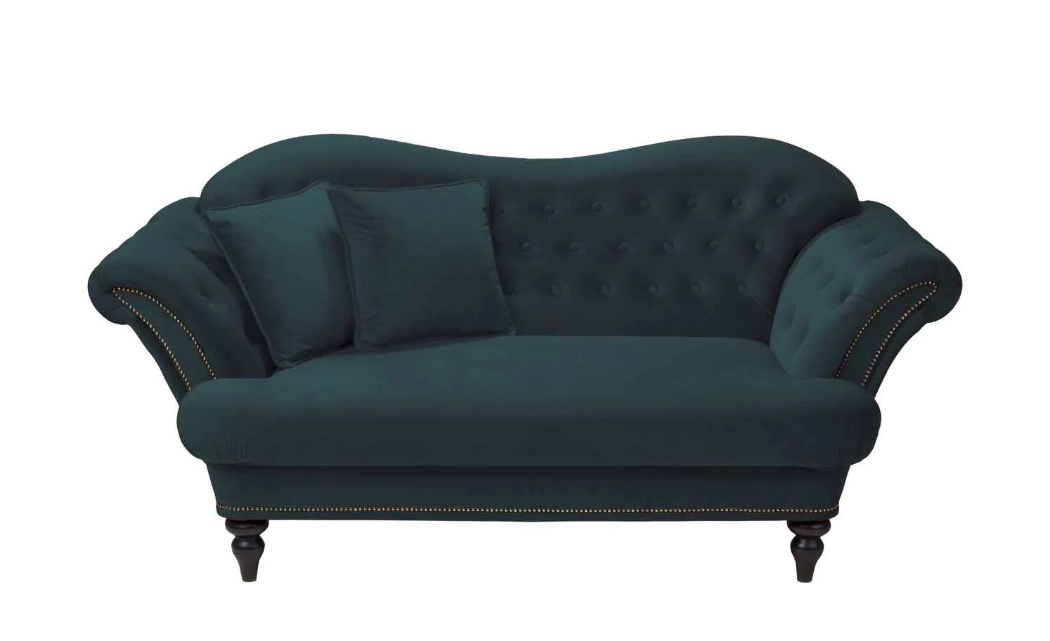 Das Sofa Sissi ist in seiner Gestaltung an den historischen Chesterfield-Stil angelehnt und strahlt Eleganz aus. Die Absteppung im klassischen Chesterfield-Muster zieht sich über Rücken- und Armlehnen hinweg, Stoffknöpfe in der Materialfarbe halten die Vertiefungen am Platz. Der Bezug ist aus Mikrofaser und hat ein samtiges Erscheinungsbild. Diese Optik passt wunderbar zum Vintage-Look der Couch. Das Erscheinungsbild der Couch wird durch feine Details abgerundet so zum Beispiel durch glänzende Metallnieten an den Nähten. Auch die formschönen Holzfüße in Wengeoptik setzen Akzente. Zwei passende Zierkissen sind im Lieferumfang enthalten.