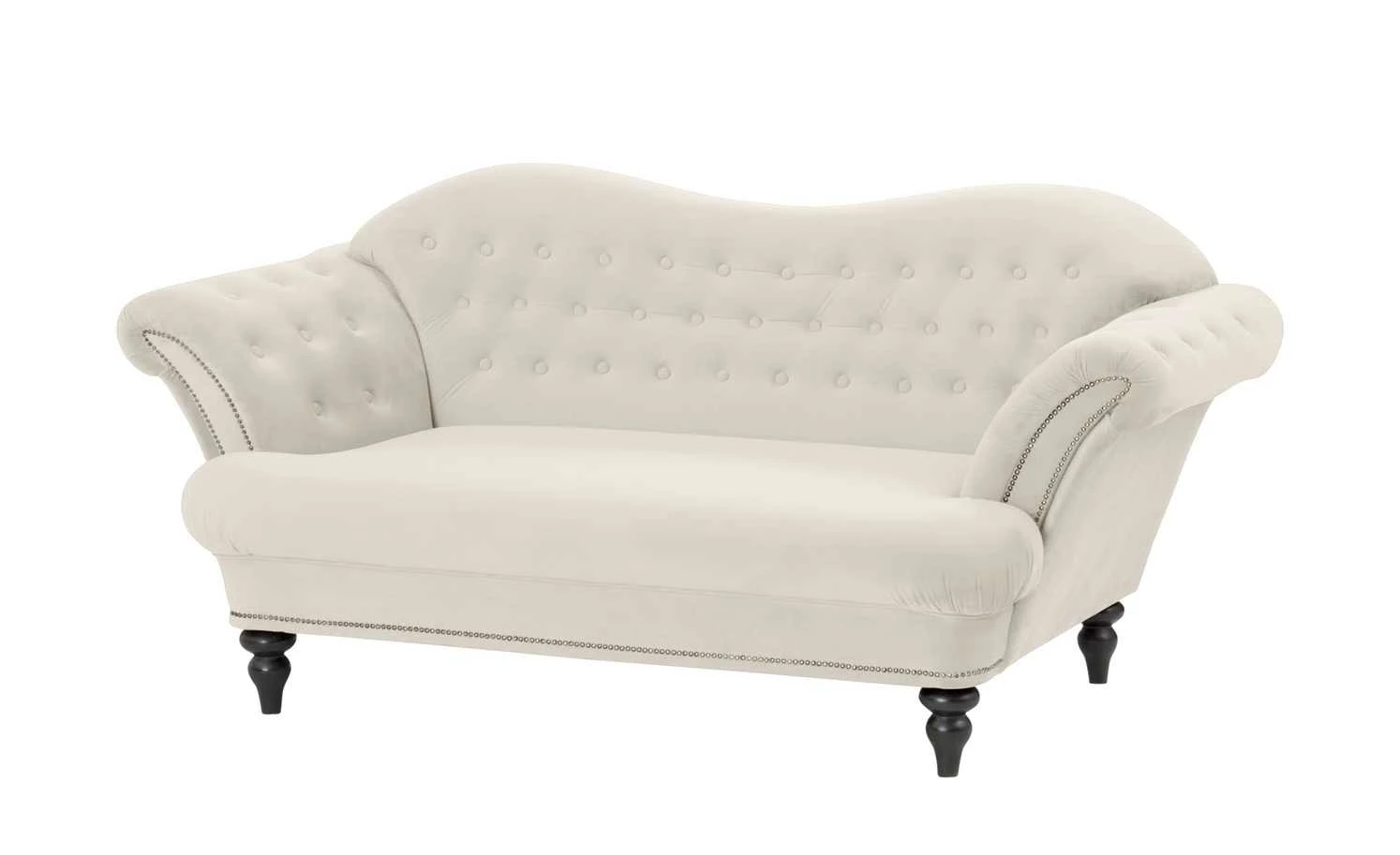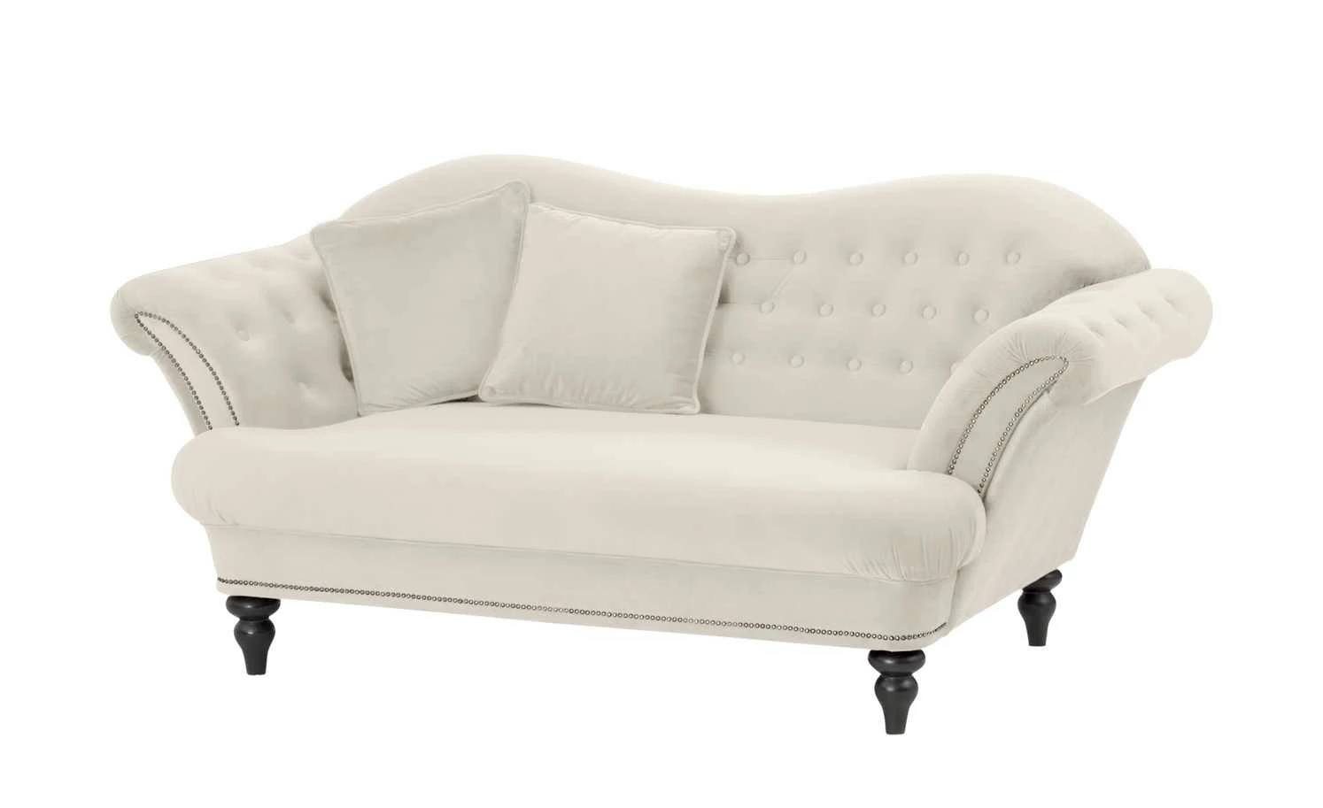 Das Sofa Sissi ist in seiner Gestaltung an den historischen Chesterfield-Stil angelehnt und strahlt Eleganz aus. Die Absteppung im klassischen Chesterfield-Muster zieht sich über Rücken- und Armlehnen hinweg, Stoffknöpfe in der Materialfarbe halten die Vertiefungen am Platz. Der Bezug ist aus Mikrofaser und hat ein samtiges Erscheinungsbild. Diese Optik passt wunderbar zum Vintage-Look der Couch. Das Erscheinungsbild der Couch wird durch feine Details abgerundet so zum Beispiel durch glänzende Metallnieten an den Nähten. Auch die formschönen Holzfüße in Wengeoptik setzen Akzente. Zwei passende Zierkissen sind im Lieferumfang enthalten.