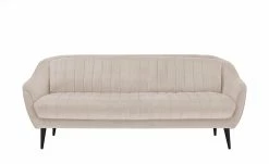 Retro und dennoch modern – das ist das Sofa Sophia. Passend zur Formgebung ist Sophia rundherum mit einer Mikrofaser in Velouroptik bezogen. Der Stoff hebt den Retrolook wunderbar hervor. Im Sitz- und Rückenbereich ist er dekorativ gesteppt. Da auch die Rückseite des Dreisitzers mit dem originalen Stoff bezogen ist, kann die Couch gerne mittig im Raum stehen. Spitze schwarze Füßchen aus massivem Buchenholz sorgen für einen soliden Stand. Sophia ist mit einem komfortablen und formstabilen Polyätherschaum bezogen. Im Sitzbereich gibt es zusätzliche Gummigurte, die für eine noch bessere Abfederung sorgen.