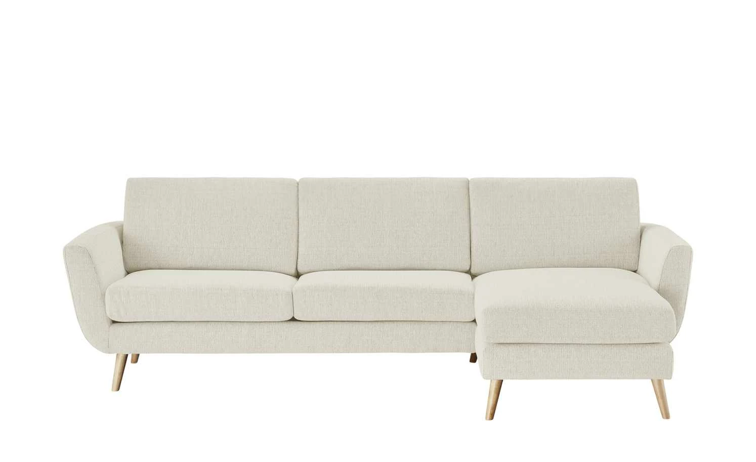 Das Ecksofa Smilla von SOHO ist eine Komfortoase mit Scandi-Chic. Das Ecksofa ist dezent designt und verfügt über einen gedeckten schneeweißen Farbton. Die spitzen Füße aus Massivholz sorgen für eine natürliche Note und Retrocharme. Dank der L-Form des Sofas haben Sie die Möglichkeit, auch mal gemütlich die Beine hochzulegen. Der Bezug aus meliertem Flachgewebe umspannt die Couch einheitlich von allen Seiten. Deshalb macht Smilla auch zentral im Raum aufgestellt eine gute Figur.