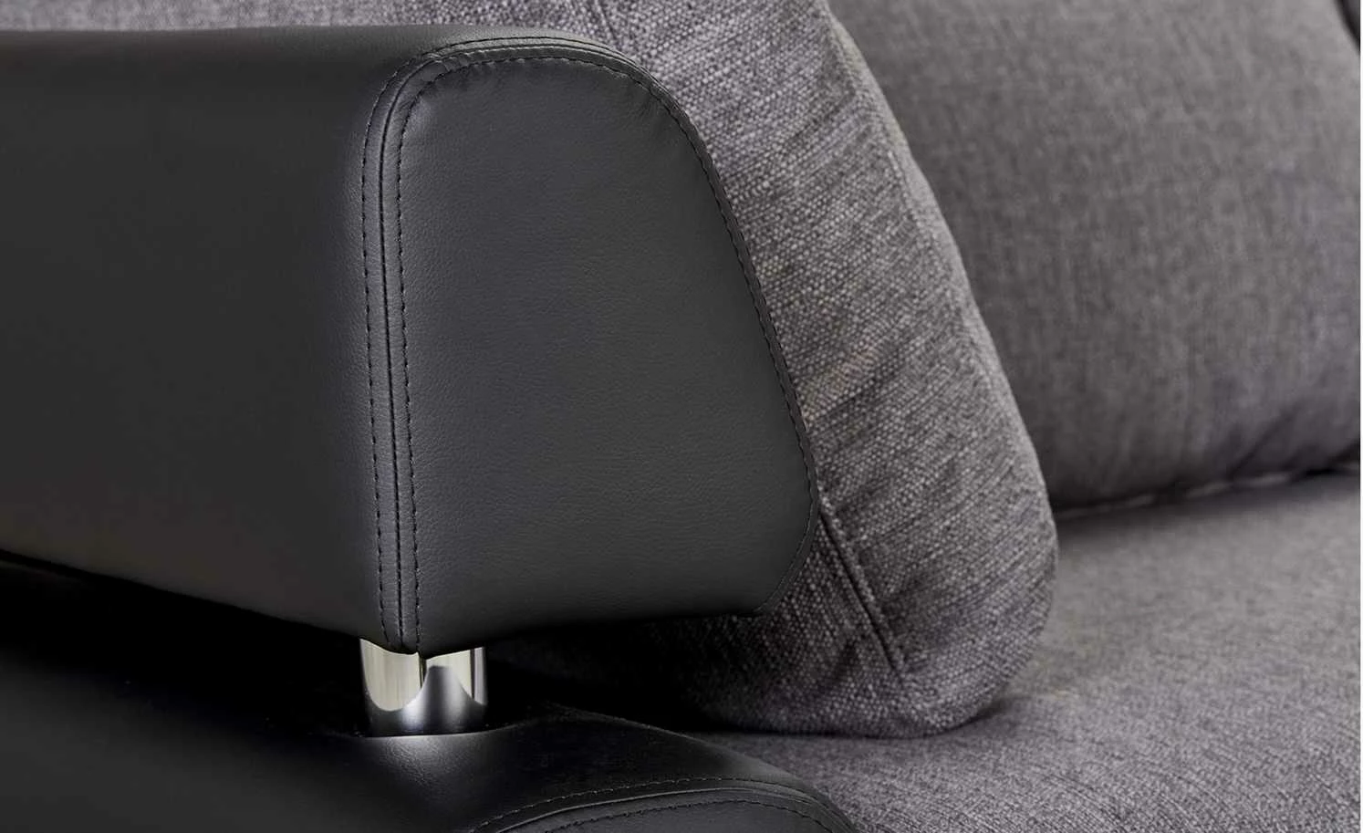 Dieses elegante, dunkle Ecksofa besticht durch seine elegante Optik und seine cleveren Funktionen. Die Kombination aus schwarzem Kunstlederbezug und grauem Webstoff zaubert eine moderne kontrastreiche Optik. Auch am Rücken ist Panama mit schwarzem Kunstleder bezogen und kann daher frei im Raum platziert werden. Der eingearbeitete Federkern auf Schaumstoff sorgt für einen angenehmen Sitzkomfort. 4 Kissen machen das Sofa noch bequemer. So steht einem gemütlichen Abend nichts mehr im Weg. Panama ist auch mit Schlaffunktion erhältlich.