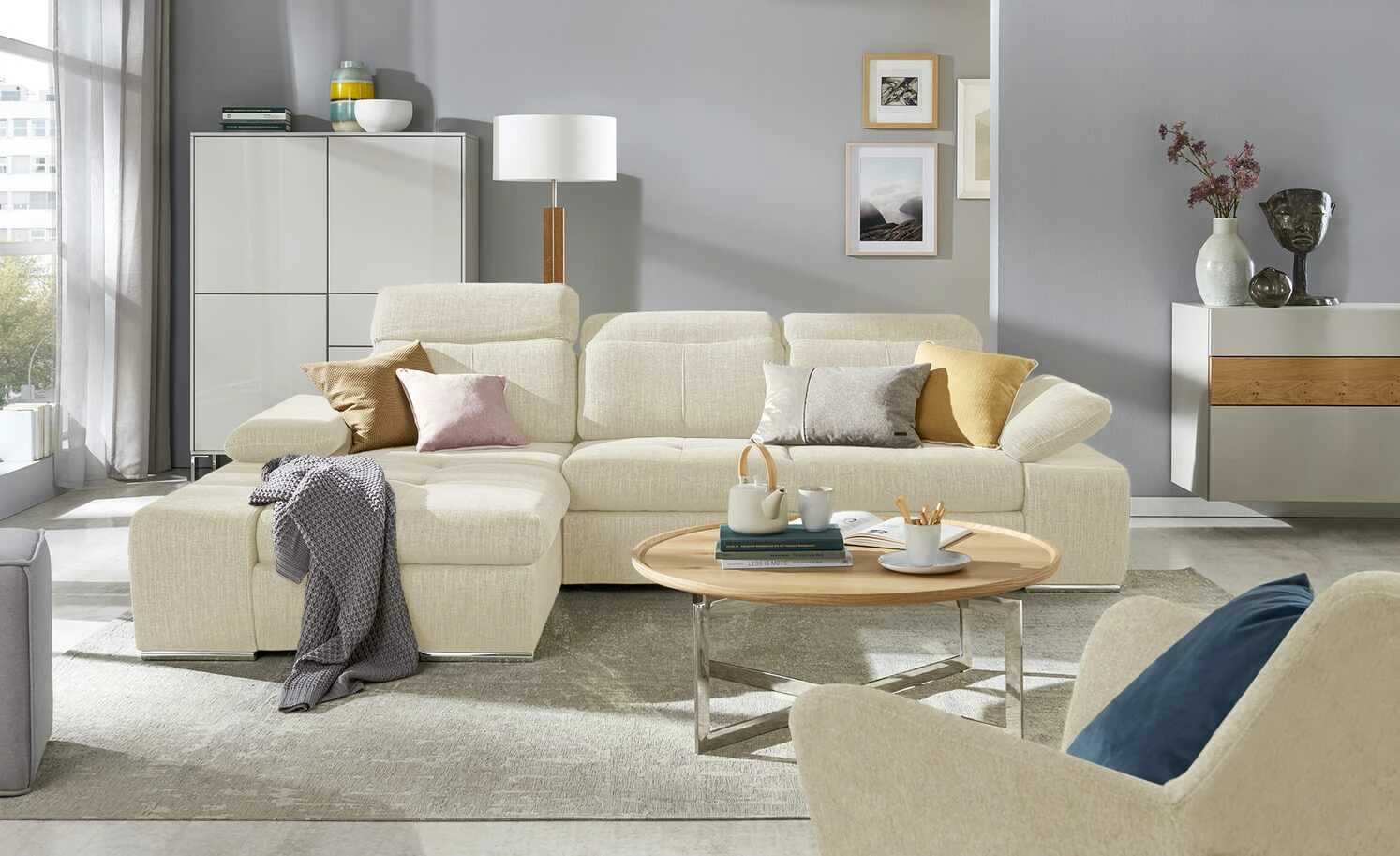 Ein Sofa aus recycelten PET-Flaschen? Gibt es! Das Ecksofa Avilla ist aber nicht nur umweltfreundlich, sondern natürlich außerdem eine bequeme Wohlfühl-Oase. Dicke Polster und einladende Arm- und Rückenlehnen sorgen für den nötigen Komfort. Verstellen Sie die Kopfteile und klappen Sie die Armlehnen kinderleicht hoch: Avilla passt sich Ihren Bedürfnissen problemlos an. Die gesamte Couch ist mit einem attraktiven, strapazierfähigen Webstoff bezogen. Die chromfarbenen Füße setzen einen edlen Kontrast und runden das Erscheinungsbild von Avilla ab. Übrigens: Wählen Sie die erweiterte Funktion, wenn Sie häufiger Übernachtungsgäste empfangen. Das Sofa ist dann zusätzlich mit einem geräumigen Bettkasten und einer praktischen Schlaffunktion ausgestattet.